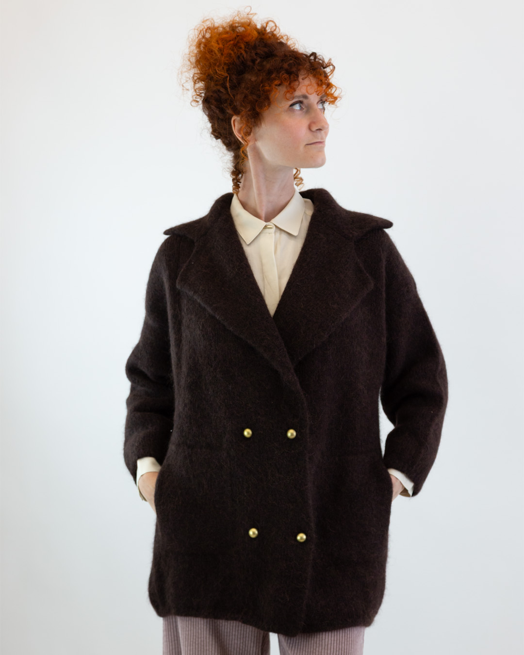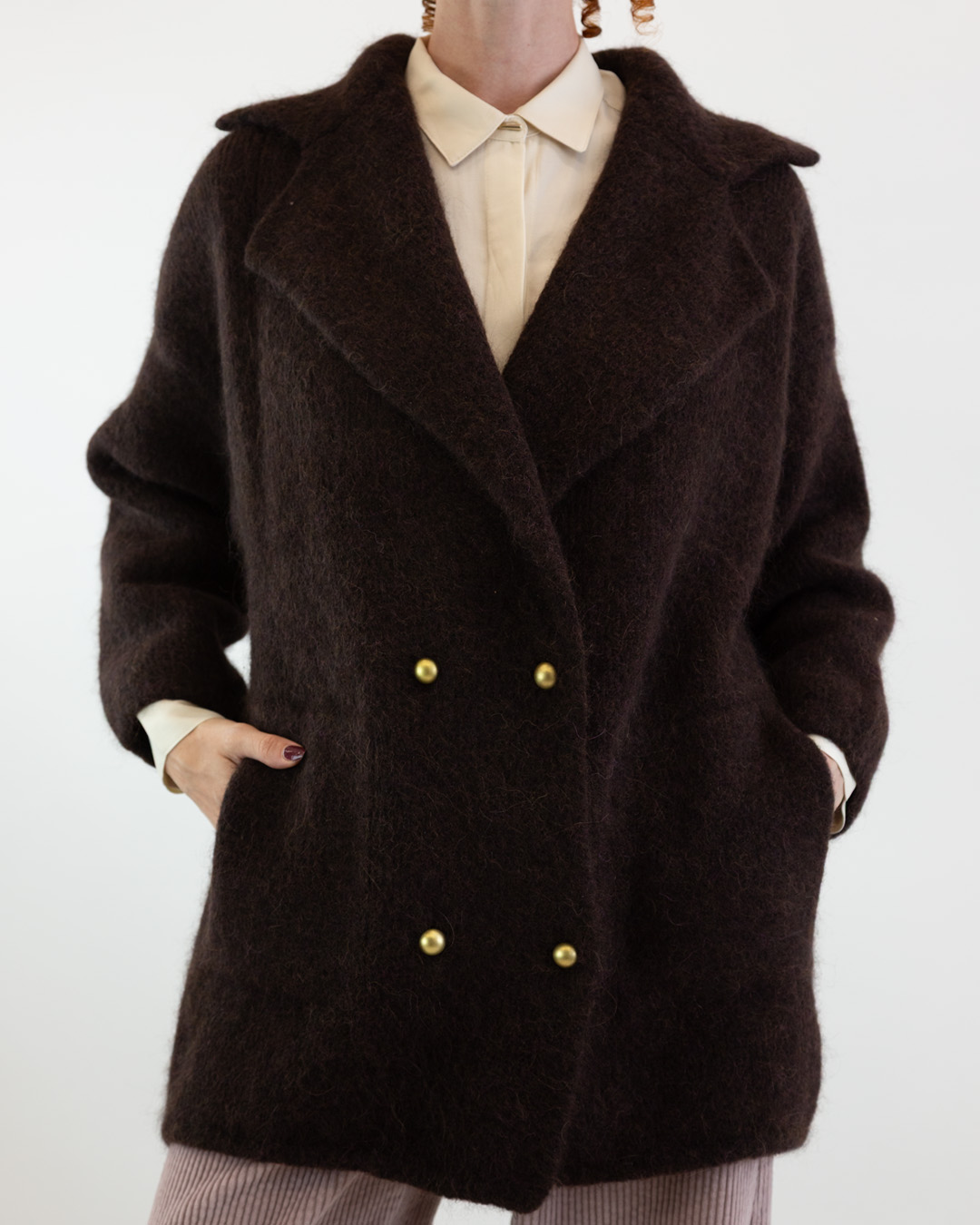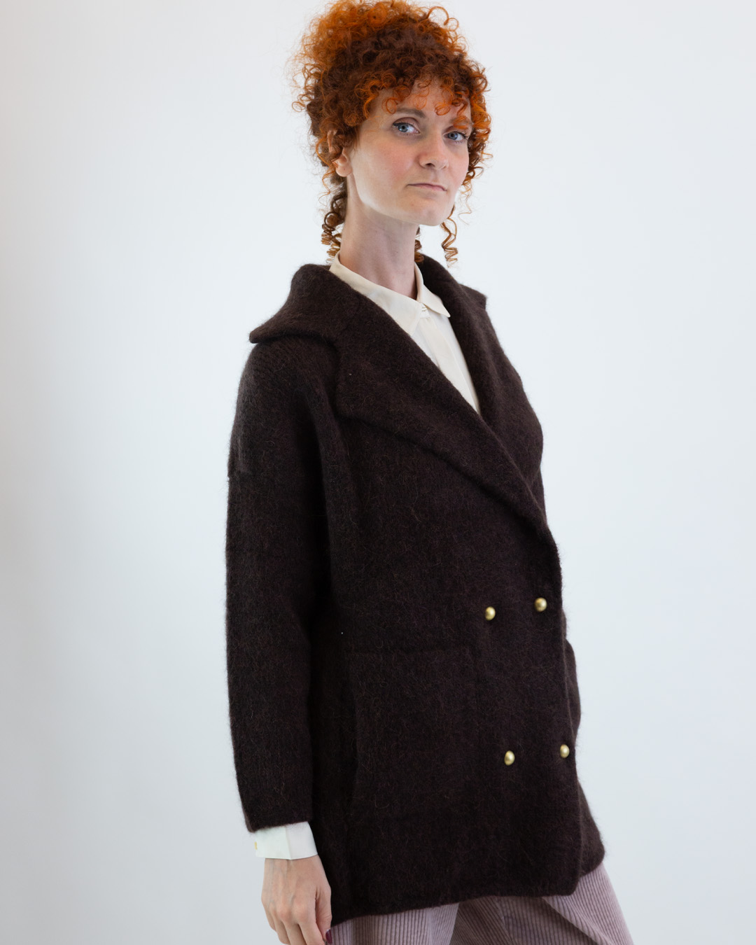 Giacca doppio petto in maglia spessa con ampio revers. Tasche laterali e chiusura con bottoni gioiello. Vestibilitร ampia e spalle scese. Composizione: 66% Alpaca, 18% Poliammide riciclato, 10% Poliammide, 4% Viscosa, 2% Elastan. Made in Italy.