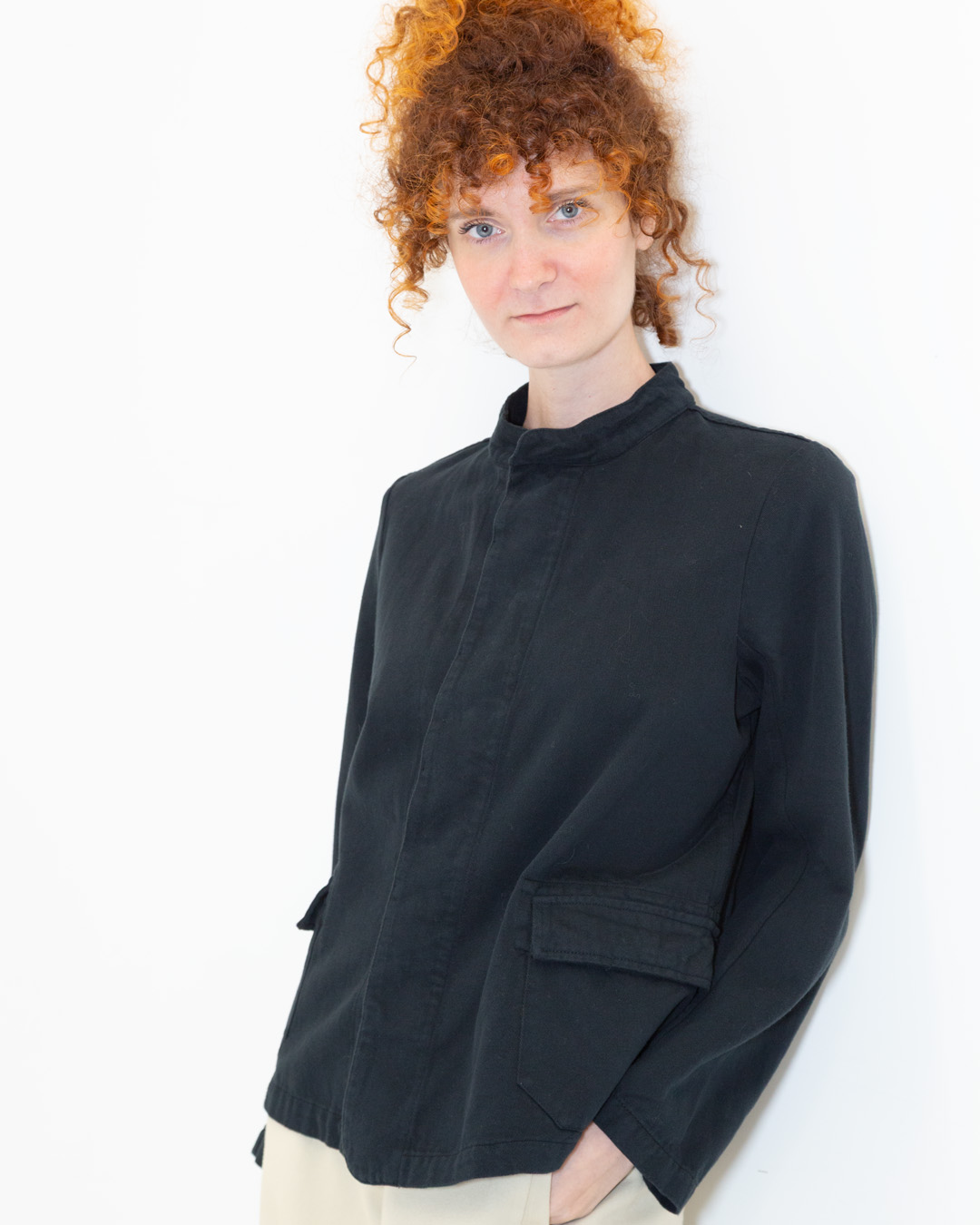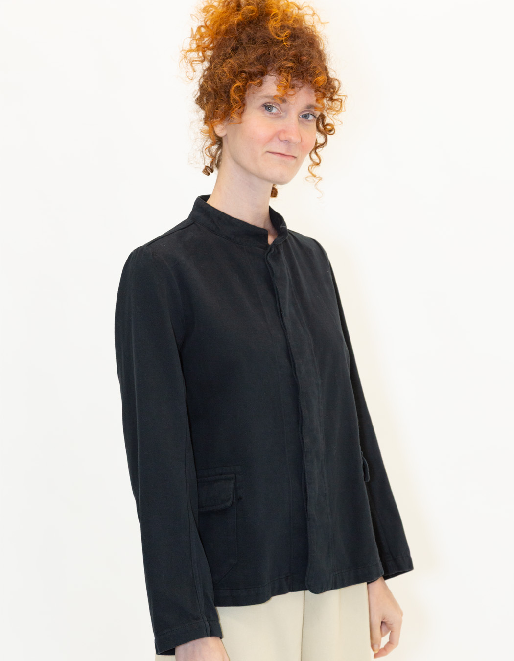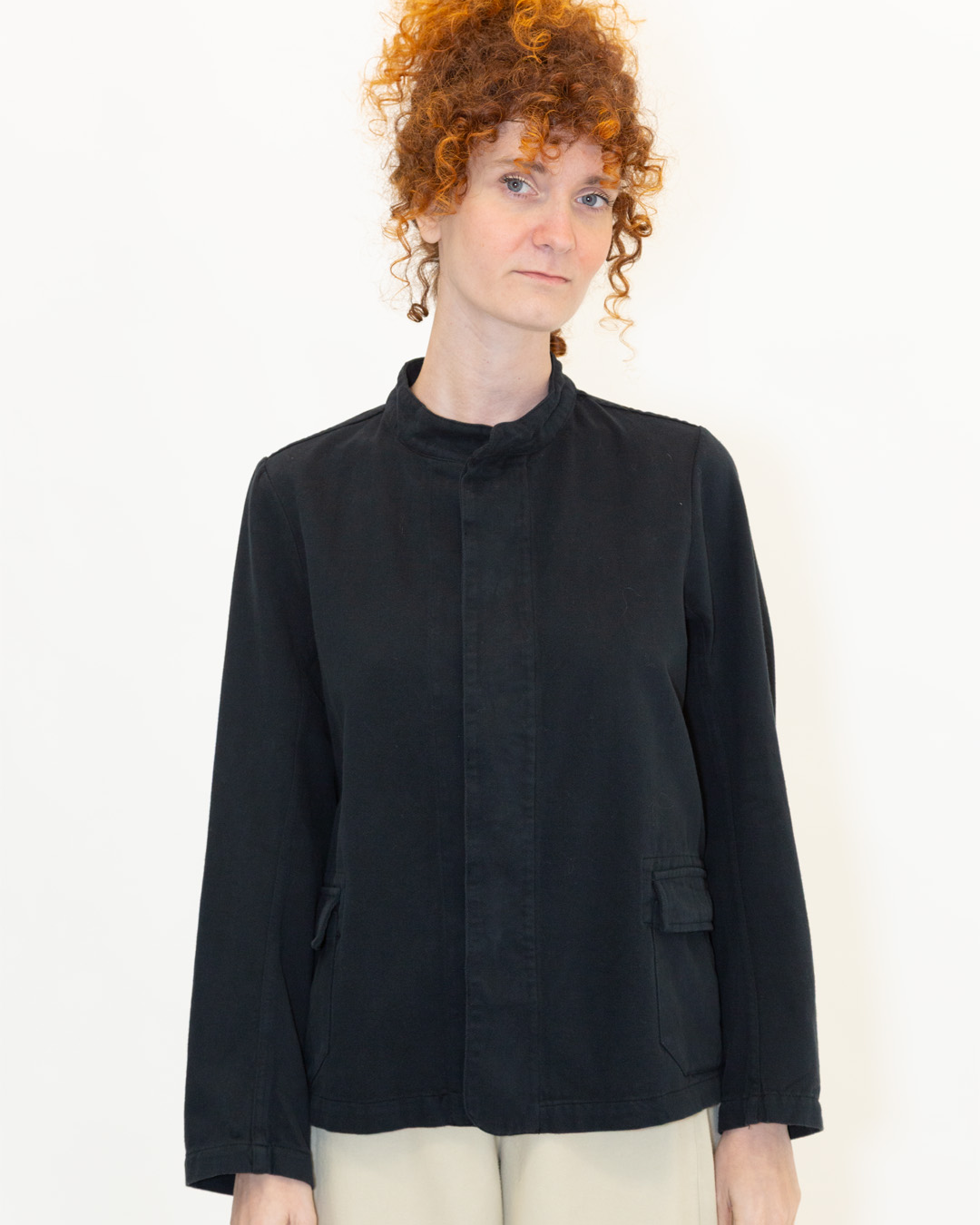 Giacca tinta in capo realizzata in filato di cotone 100%. Collo alla coreana, abbottonatura a scomparsa e tasche laterali con patta.
