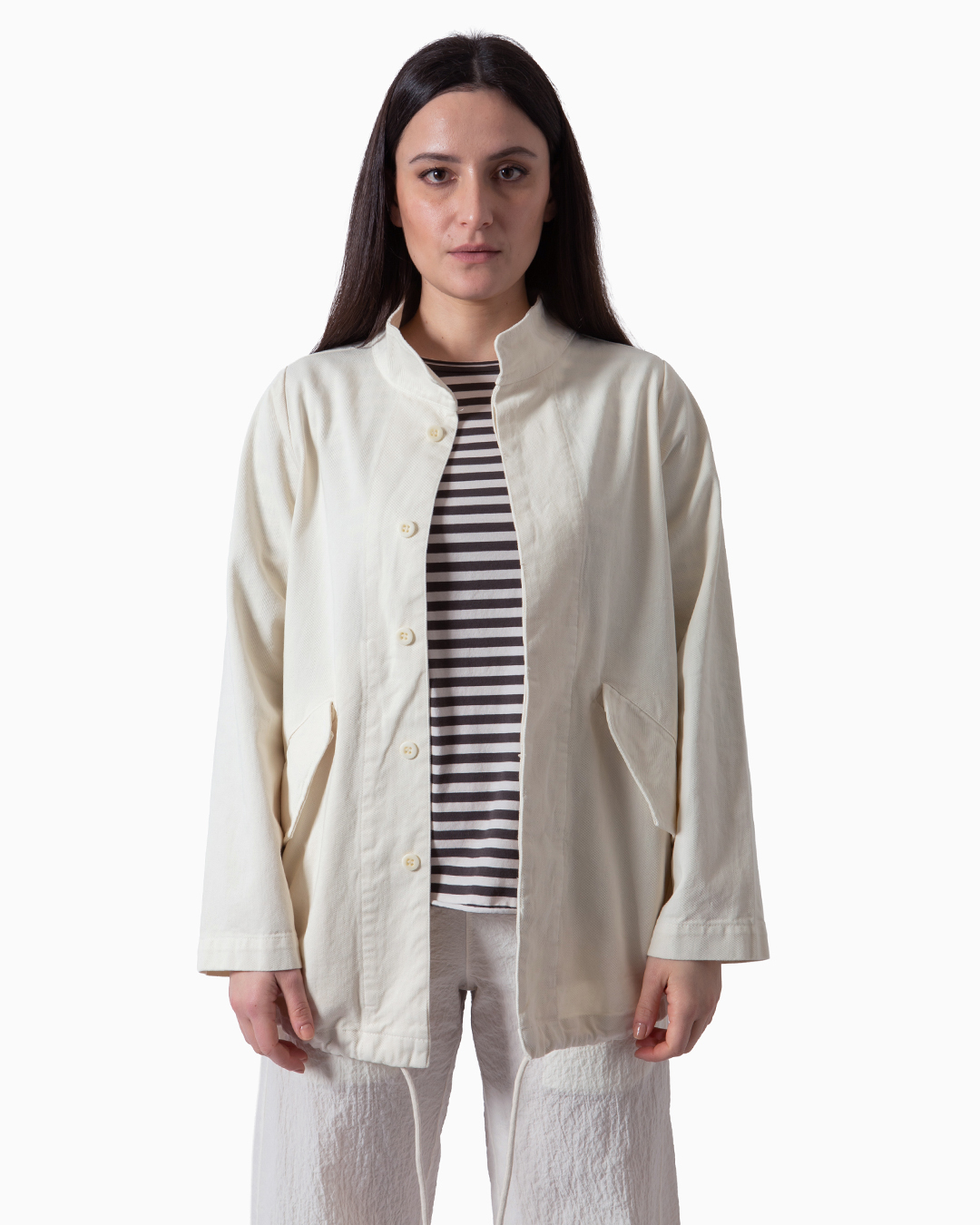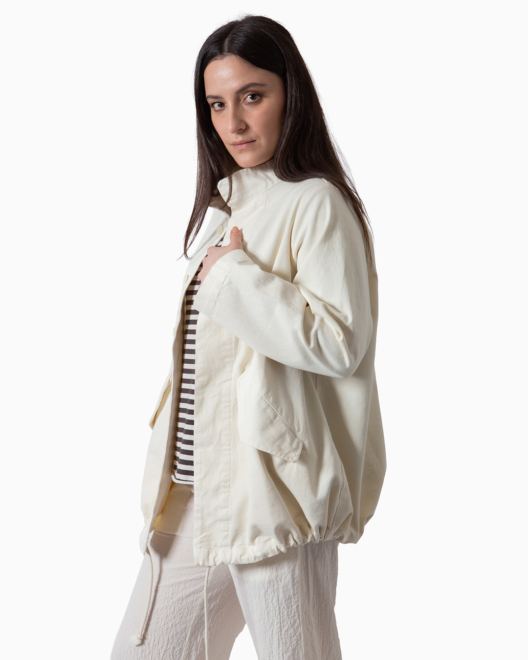 Giacca realizzata in filato di cotone%. Forma a trapezio con arricciatura sull’orlo. Lunghezza regolabile e tasche laterali. Chiusura nascosta con bottoni. Made in Italy.