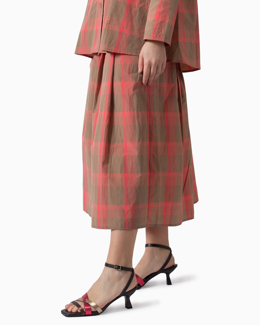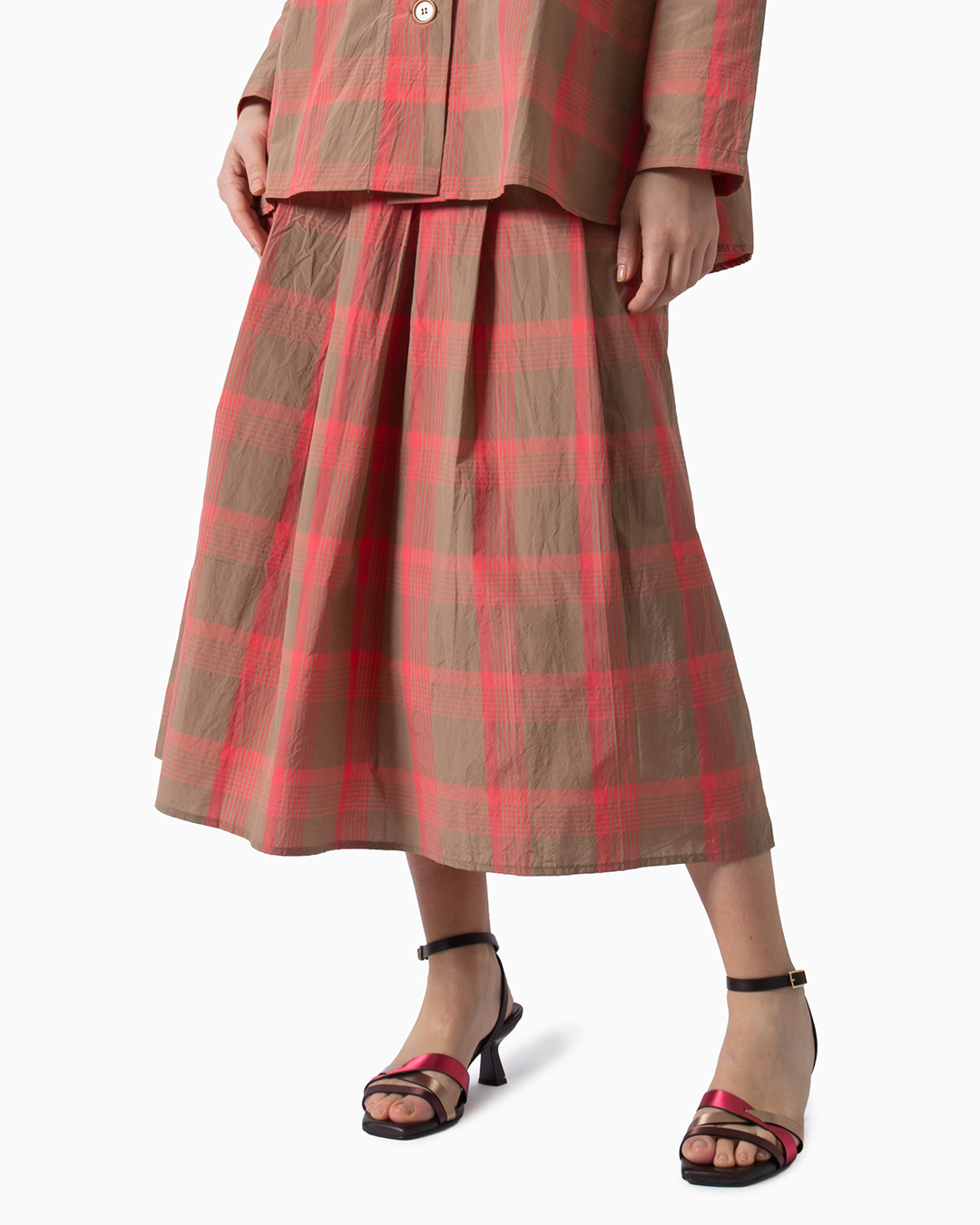 Gonna sui toni del rosa corallo e del beige. Taglio ampio e svasato. Elastico in vita. Composizione: 80% cotone, 10% lino, 10% poliammide. Made in Italy.