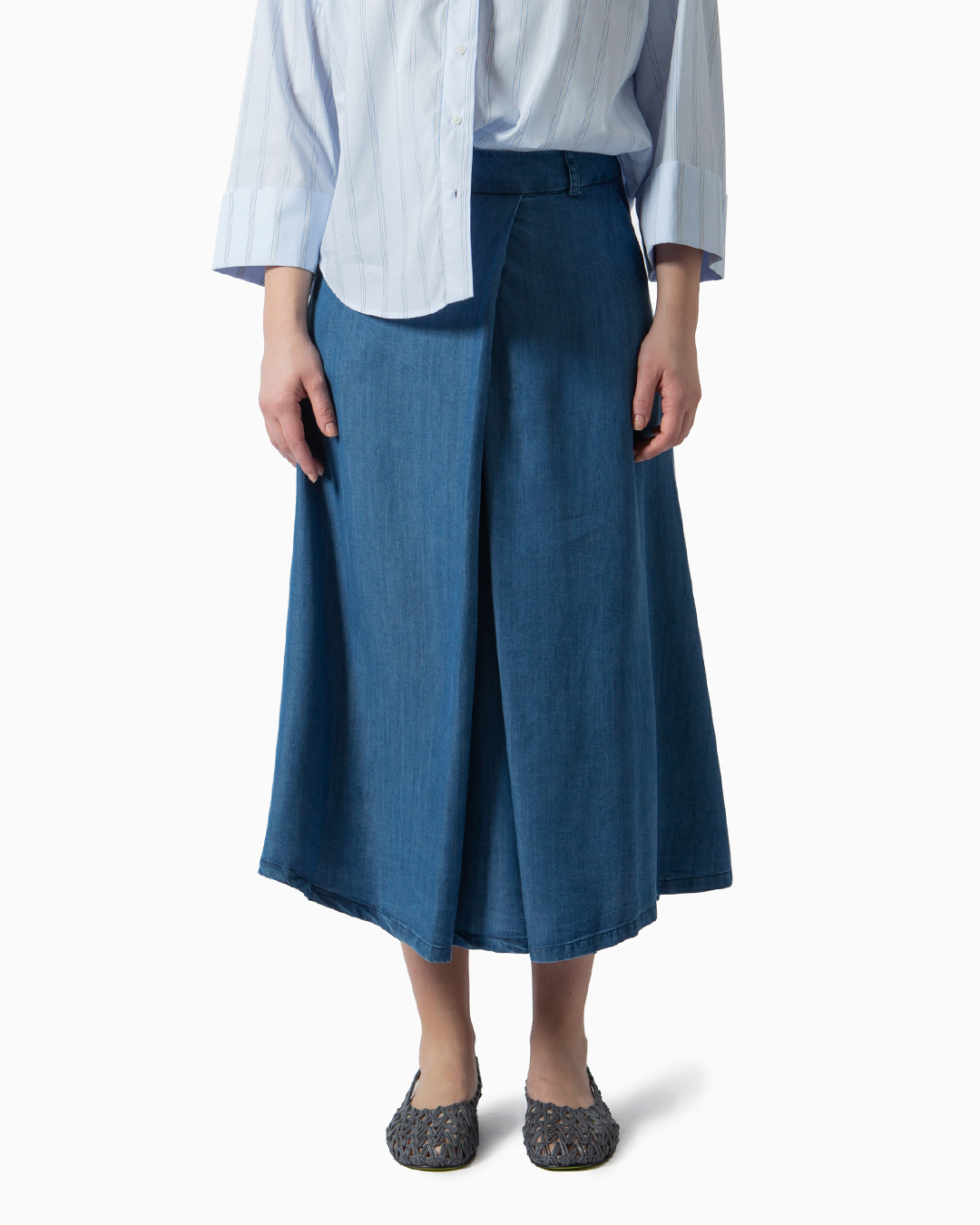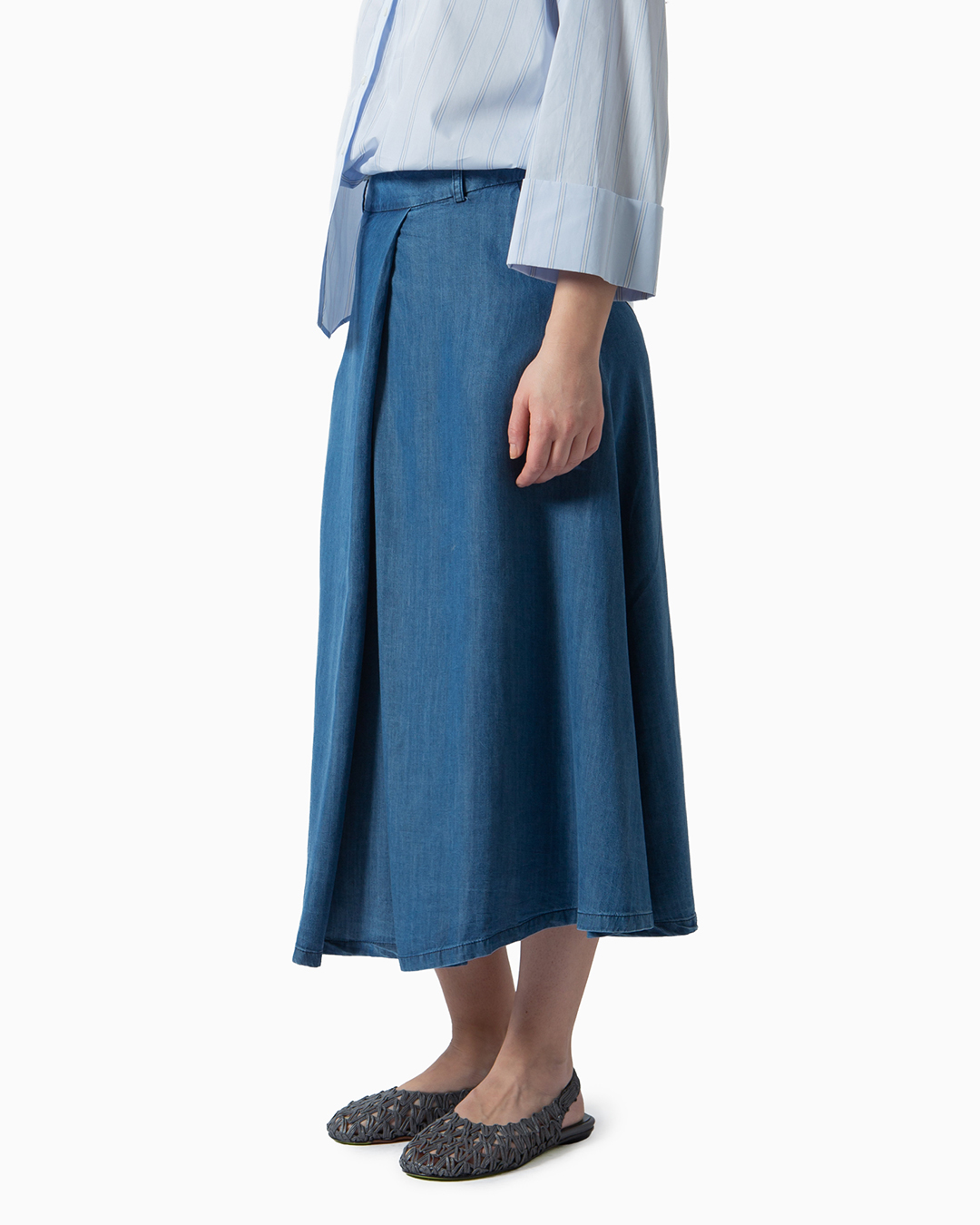 Gonna dal taglio svasato in jeans. Tasche laterali e chiusura posteriore con cerniera e bottone. Dettaglio pieghe sovrapposte sul davanti. Composizione: 98% cotone, 2% elastan. Made in Italy.