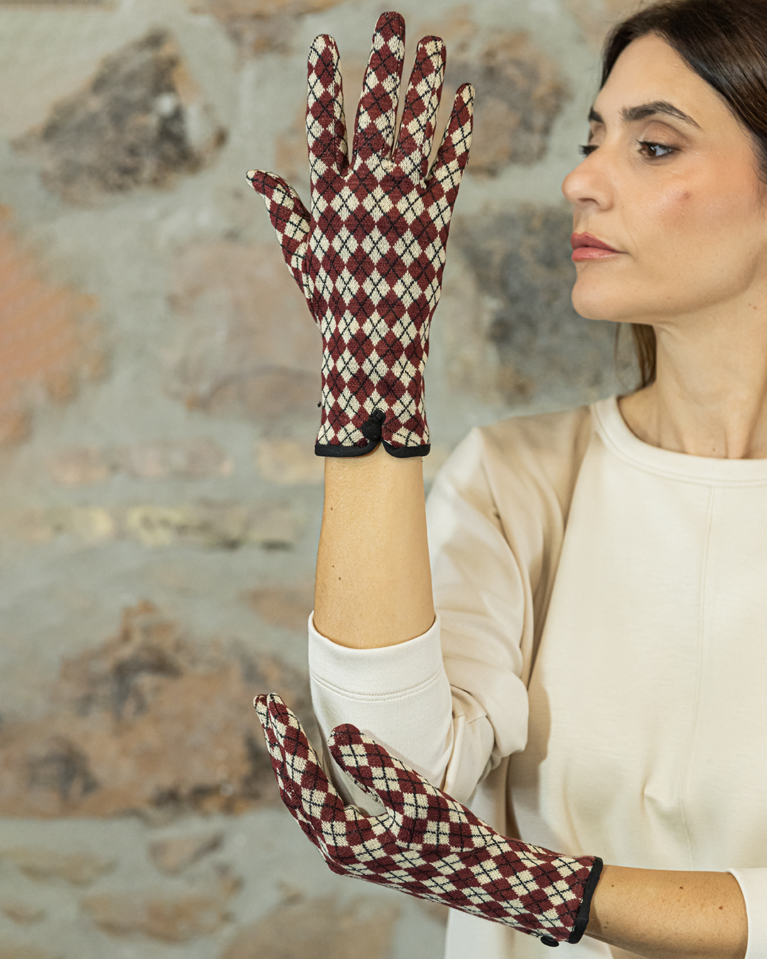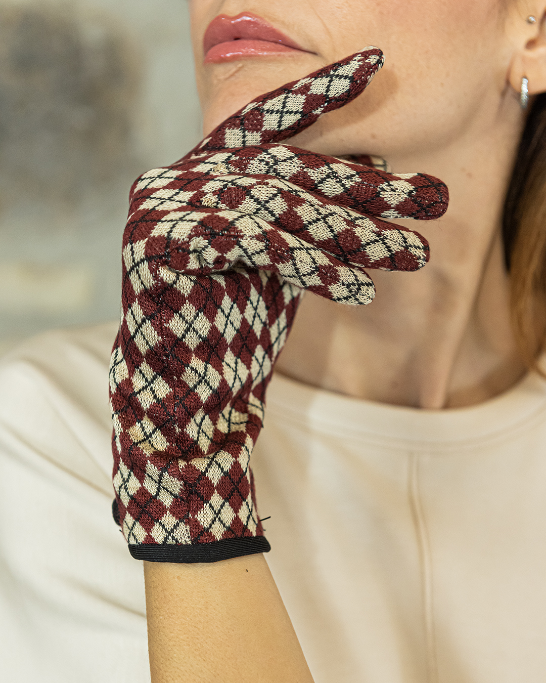 Guanti corti in tessuto jacquard fantasia.