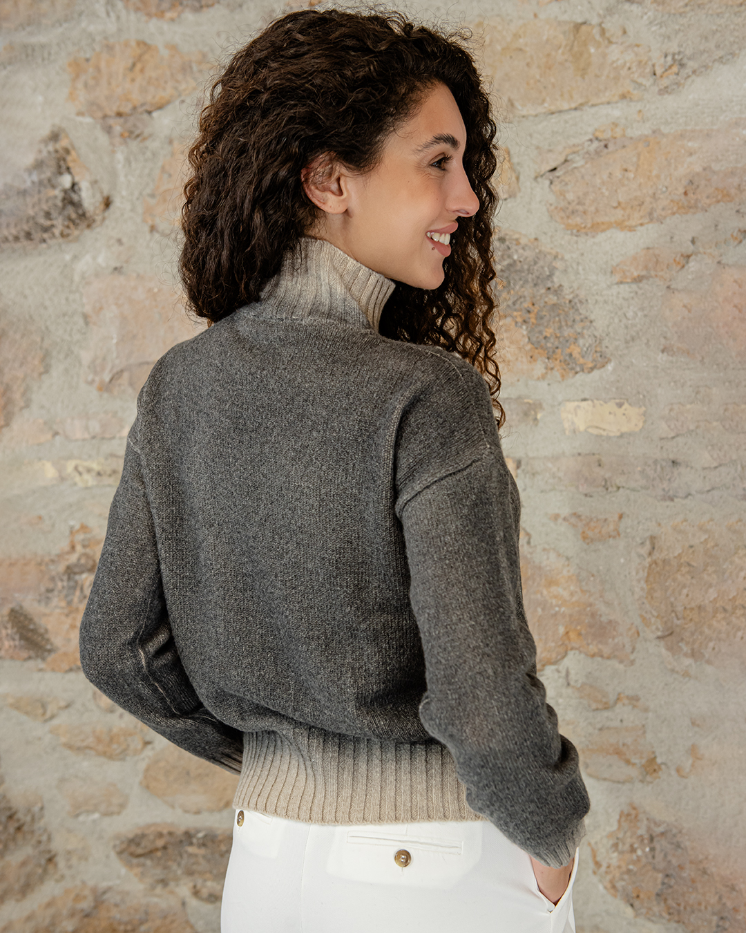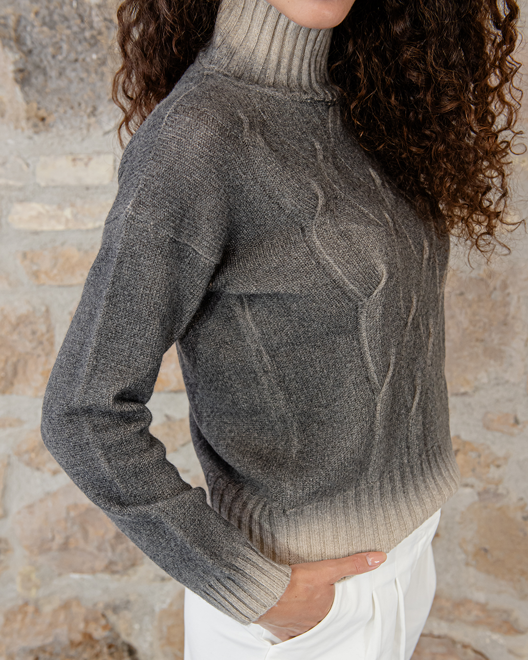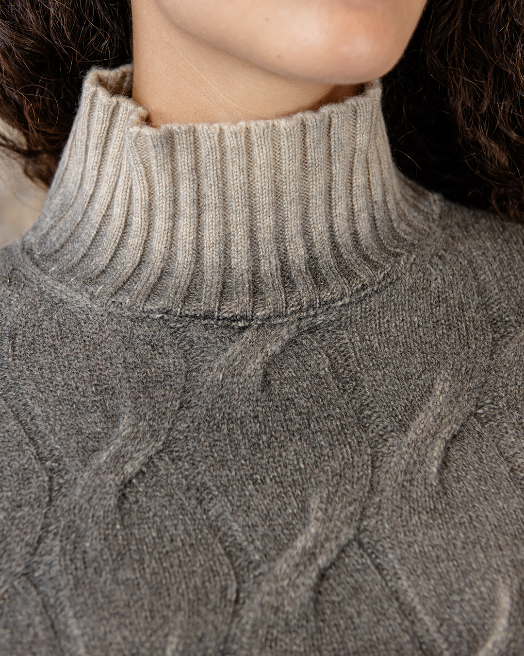 Maglione mordido in puro cashmere, collo alto a coste trecce morbide sul davanti e liscio dietro.