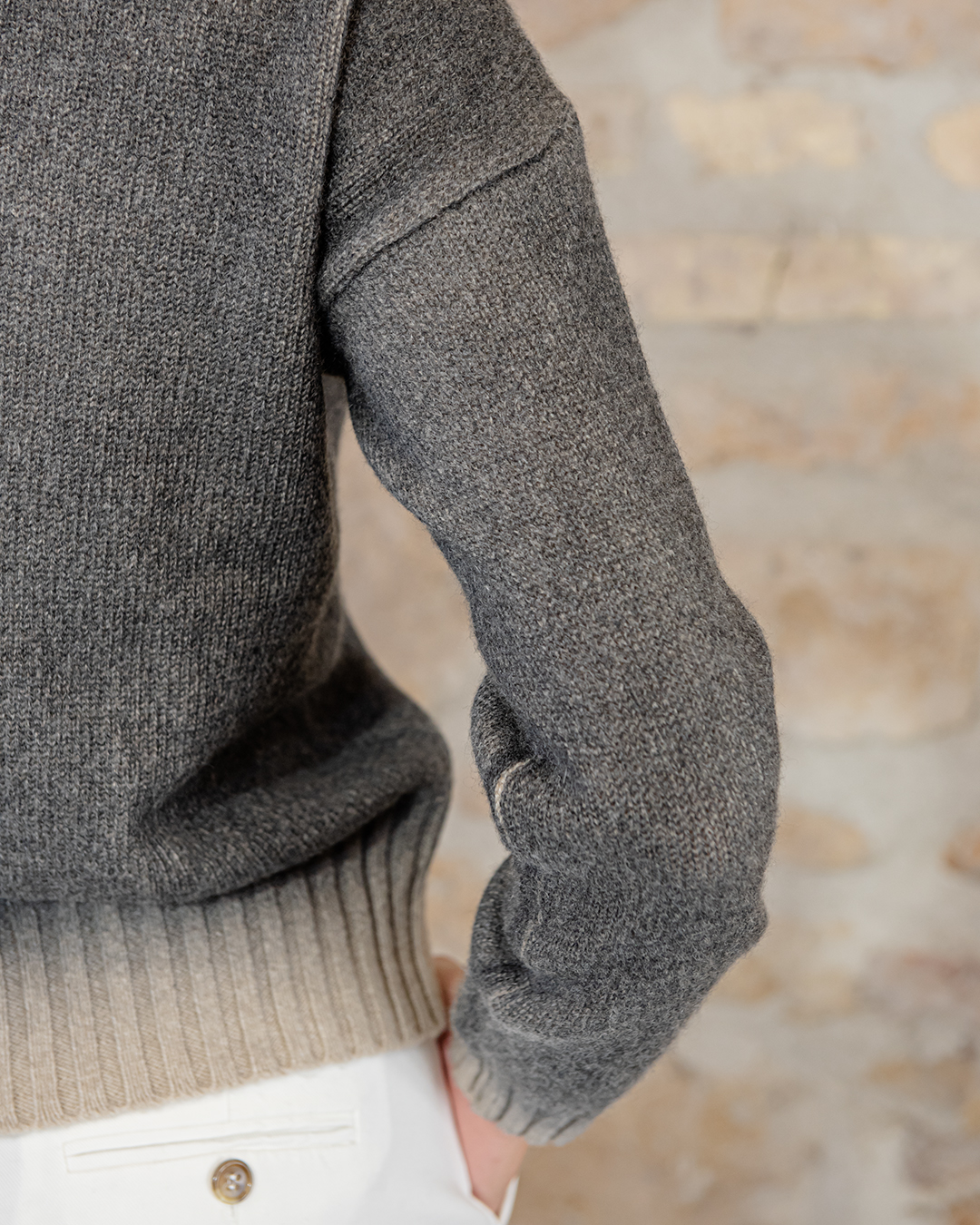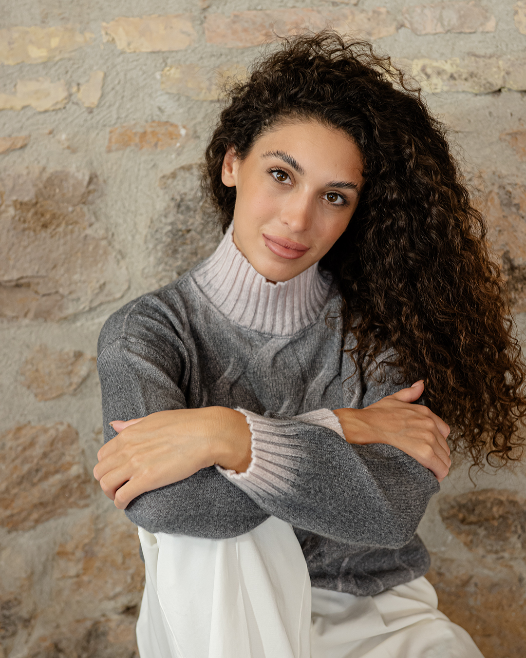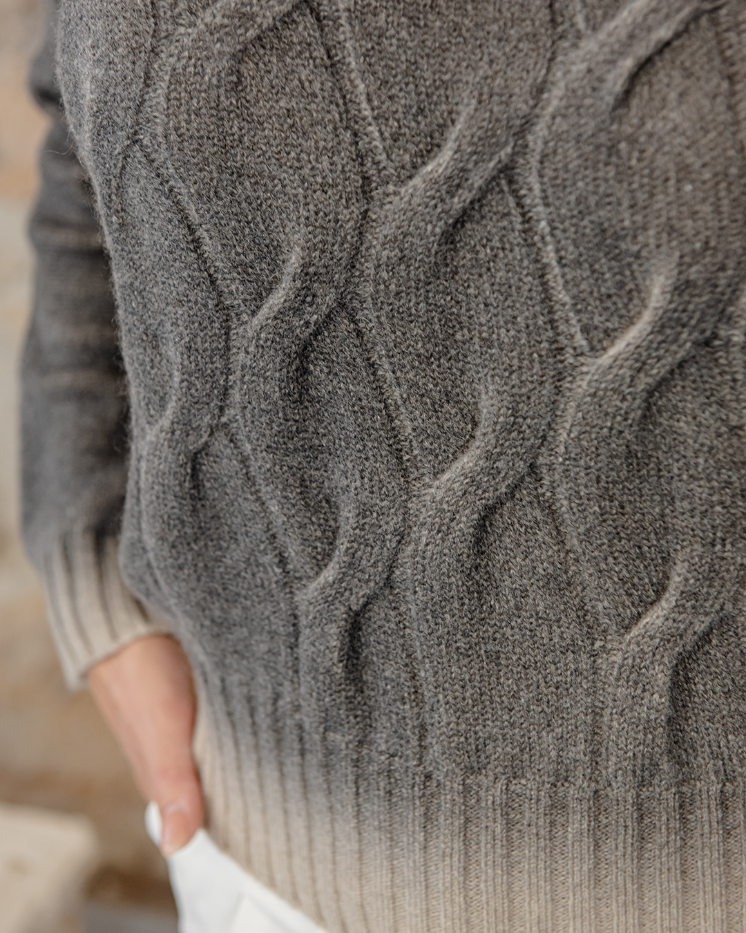Maglione mordido in puro cashmere, collo alto a coste trecce morbide sul davanti e liscio dietro.