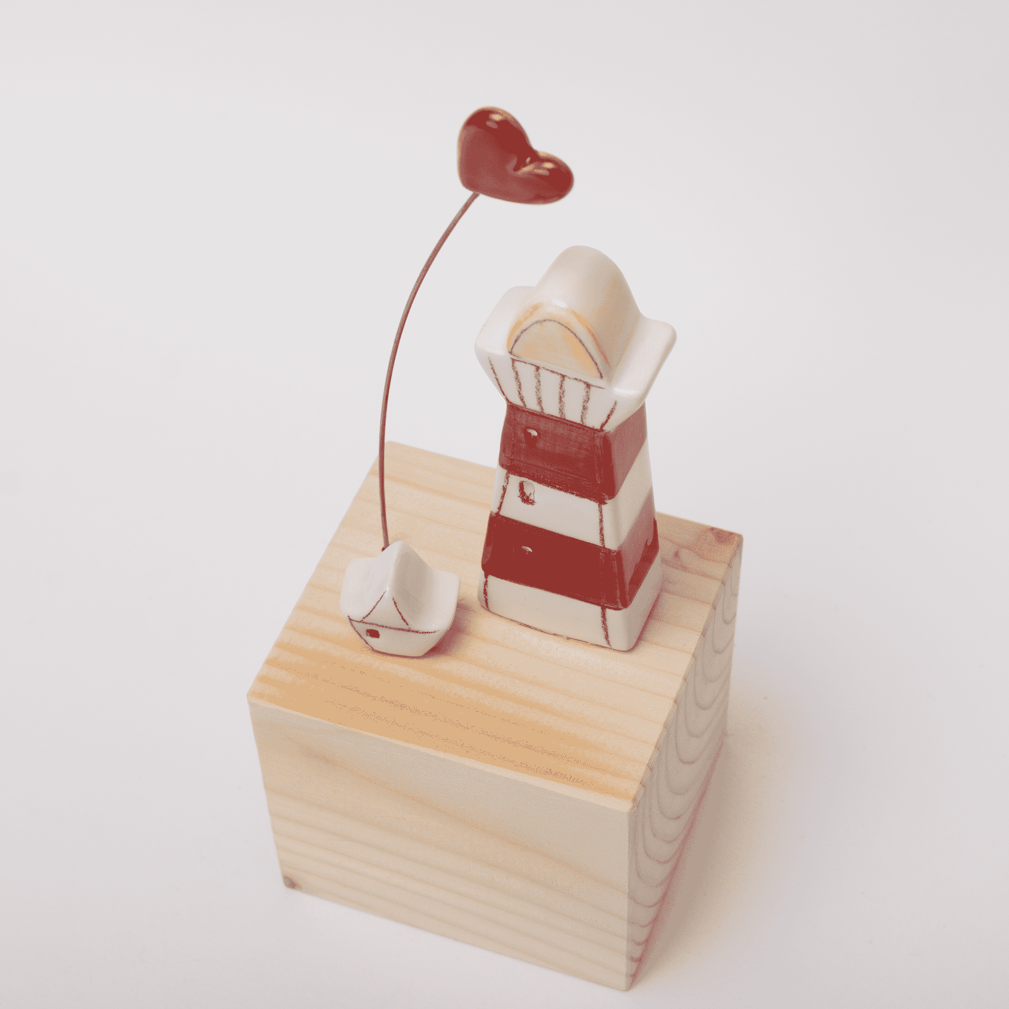 Cubotto in legno con elementi in argilla dipinta a mano.