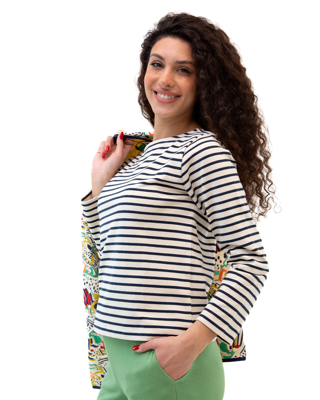 Maglia manica 3/4 con scollo alla marinaretta. Tessuto: Jersey. Colore: fondo panna e righe blu. Composizione: 100% cotone. Design in Holland.