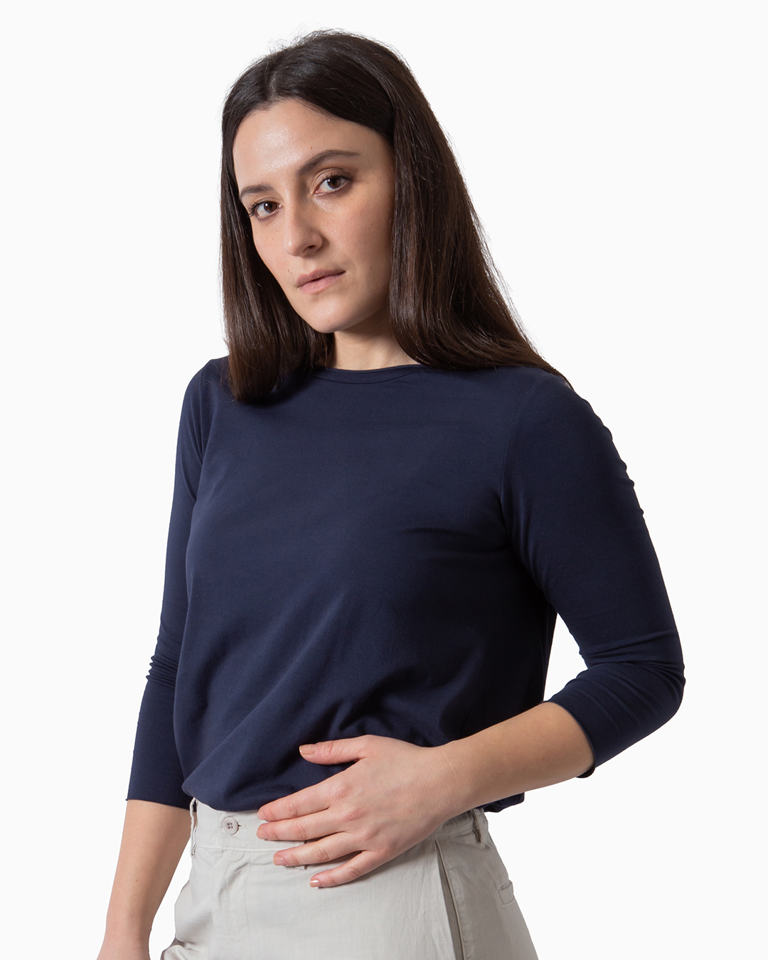 Maglia a maniche lunghe con scollo rotondo. Maglia tinta in capo artigianalmente. Composizione: 94% cotone, 6% elastan. Made in Italy.
