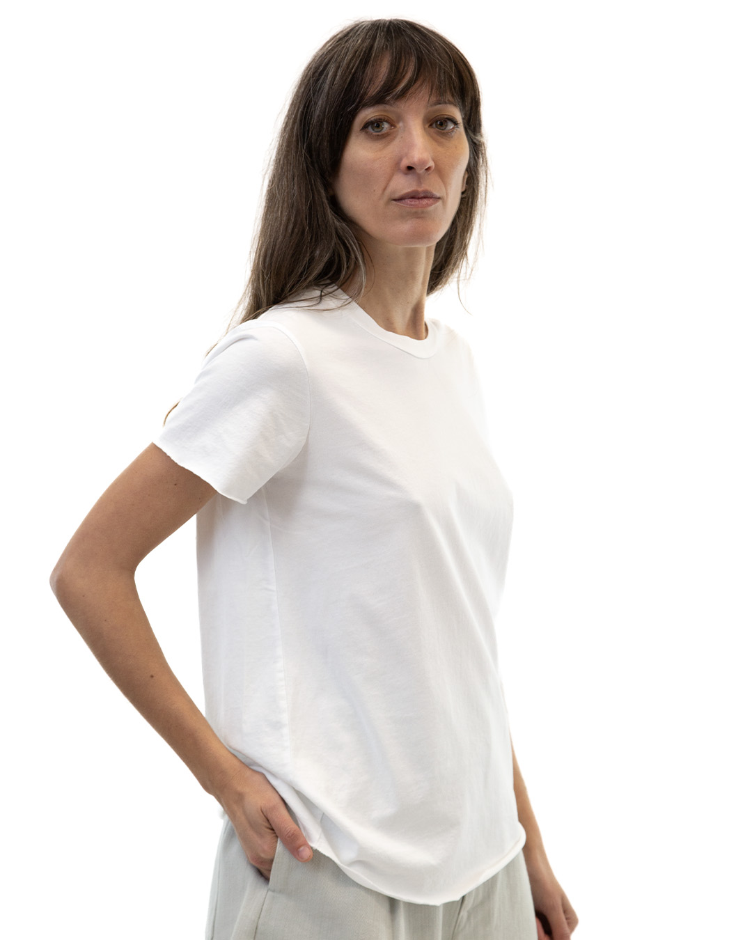 T-shirt manica corta con bordi taglio vivo. Giro collo. Vestibilita regolare. Colore: bianco. Tessuto Jersey di cotone. Composizione: 100% cotone. Produzione artigianale italiana. Made in Italy.