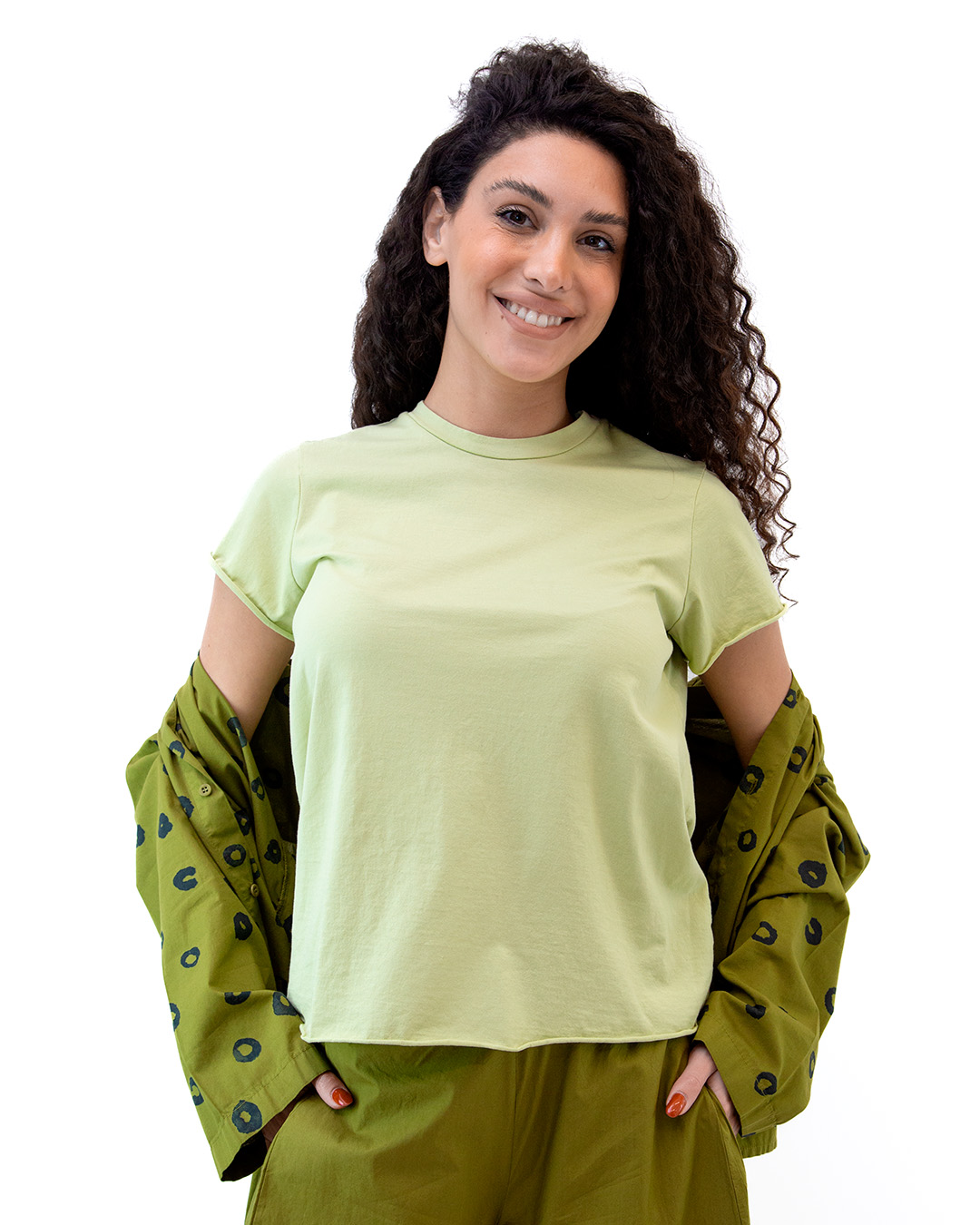 T-shirt manica corta con bordi taglio vivo. Giro collo. Vestibilita regolare. Colore: verde pisello. Tessuto Jersey di cotone. Composizione: 100% cotone. Produzione artigianale italiana. Made in Italy.