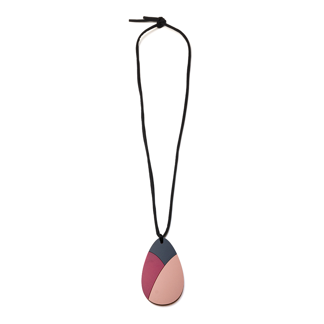 Collana con elemento in nylon e plexiglass stampato 3D. Specchio sul retro. Dimensioni elemento 9,8 x 6 cm. Cordoncino in tessuto lungo 44 cm. Produzione artigianale italiana.