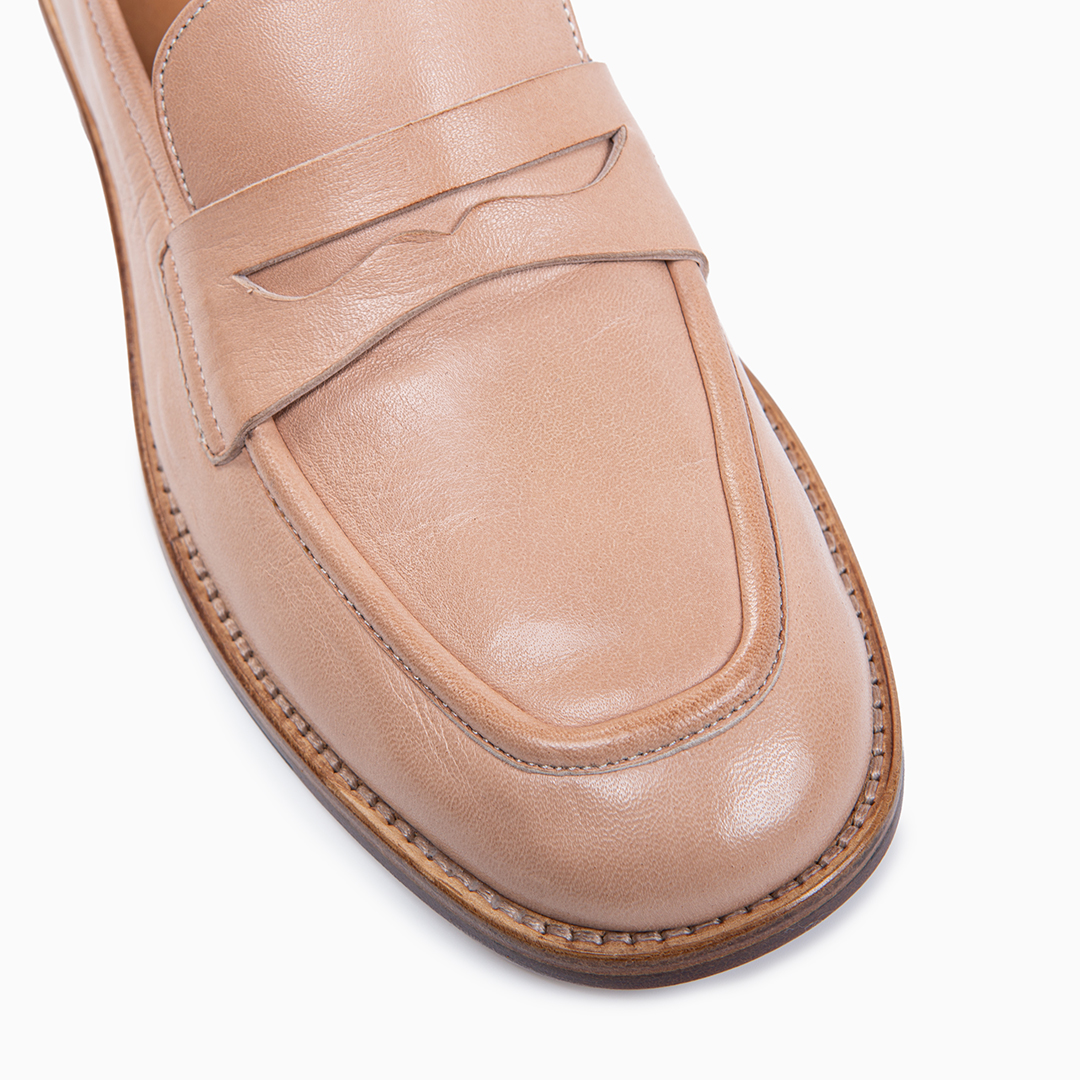 Mocassino in morbida pelle liscia color cipria. Altezza tacco 2 cm. Produzione artigianale italiana.