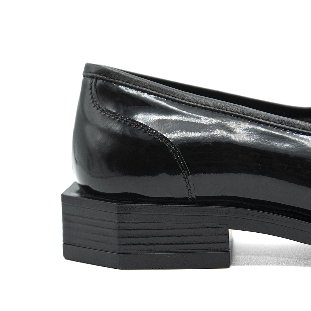 Tomaia in pelle liscia, vernice e stampata.