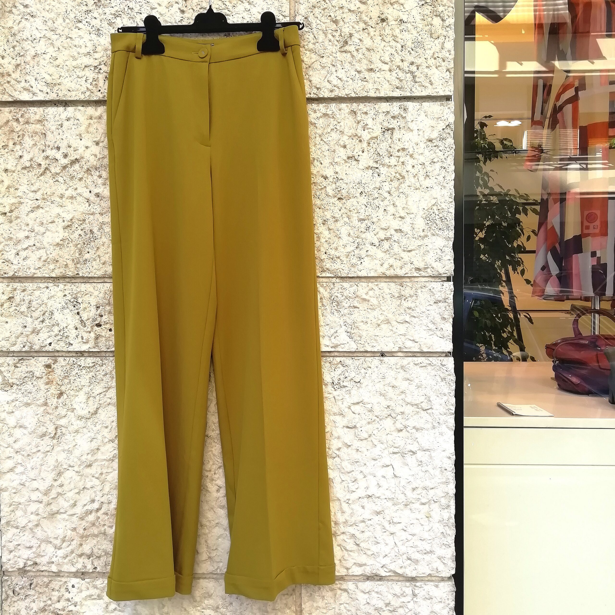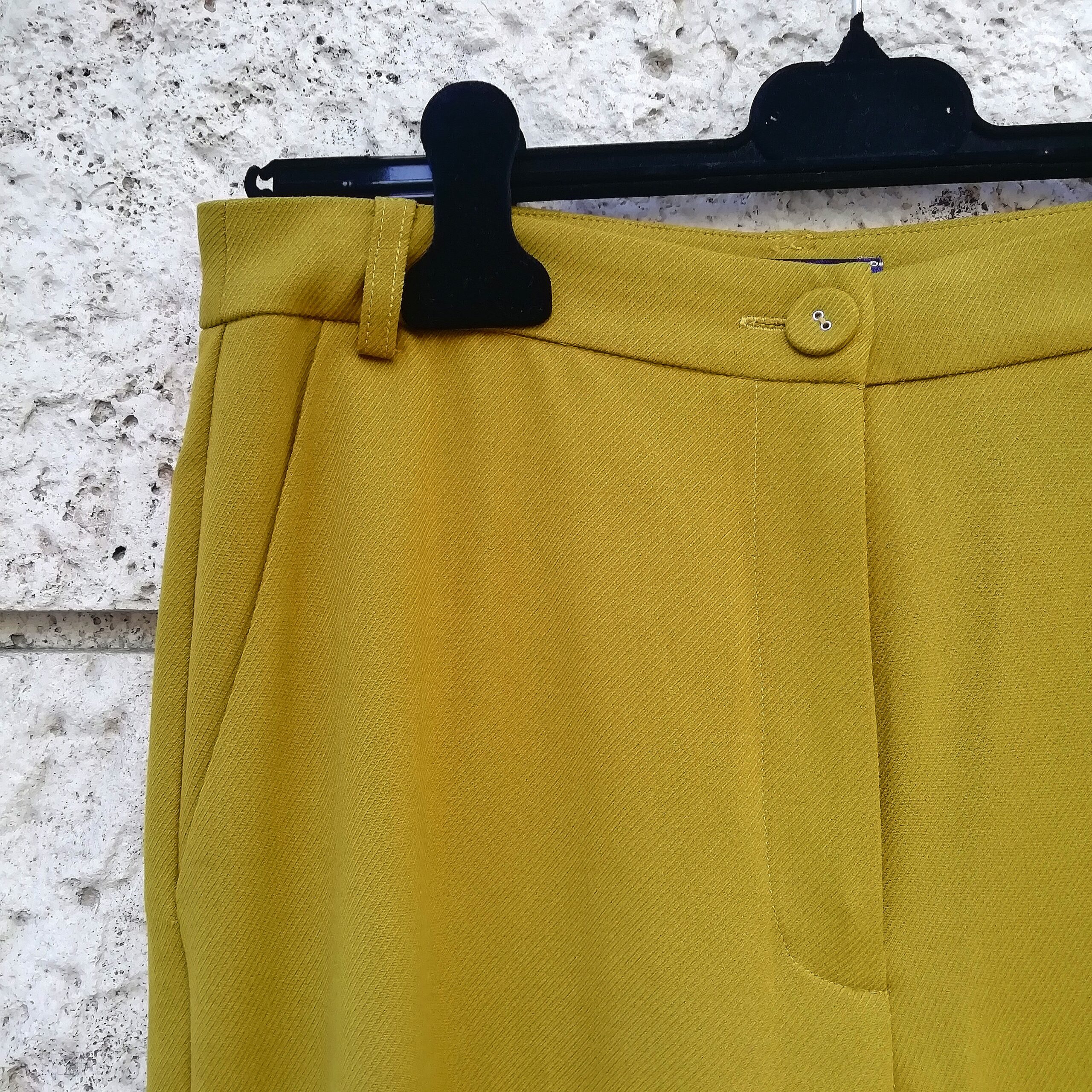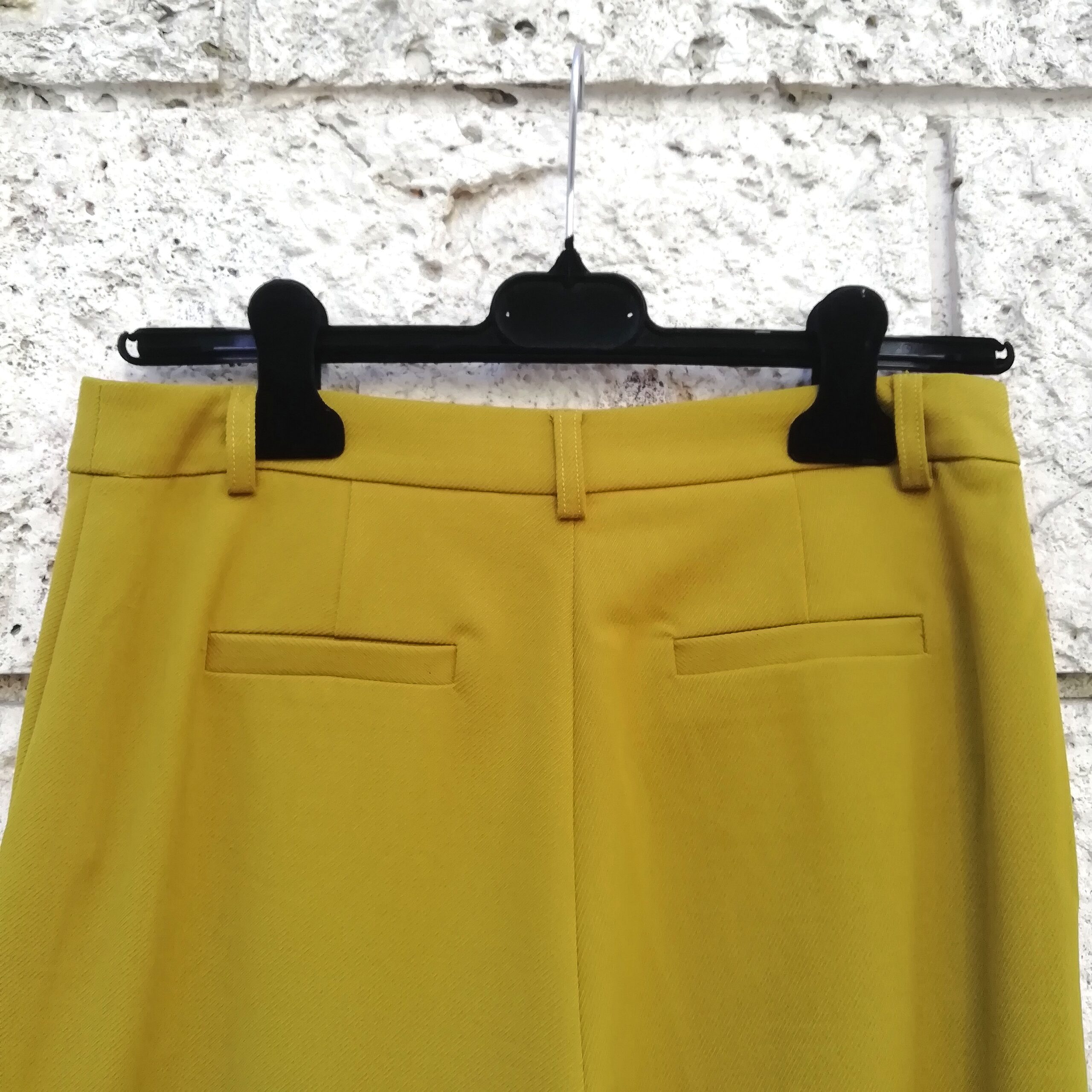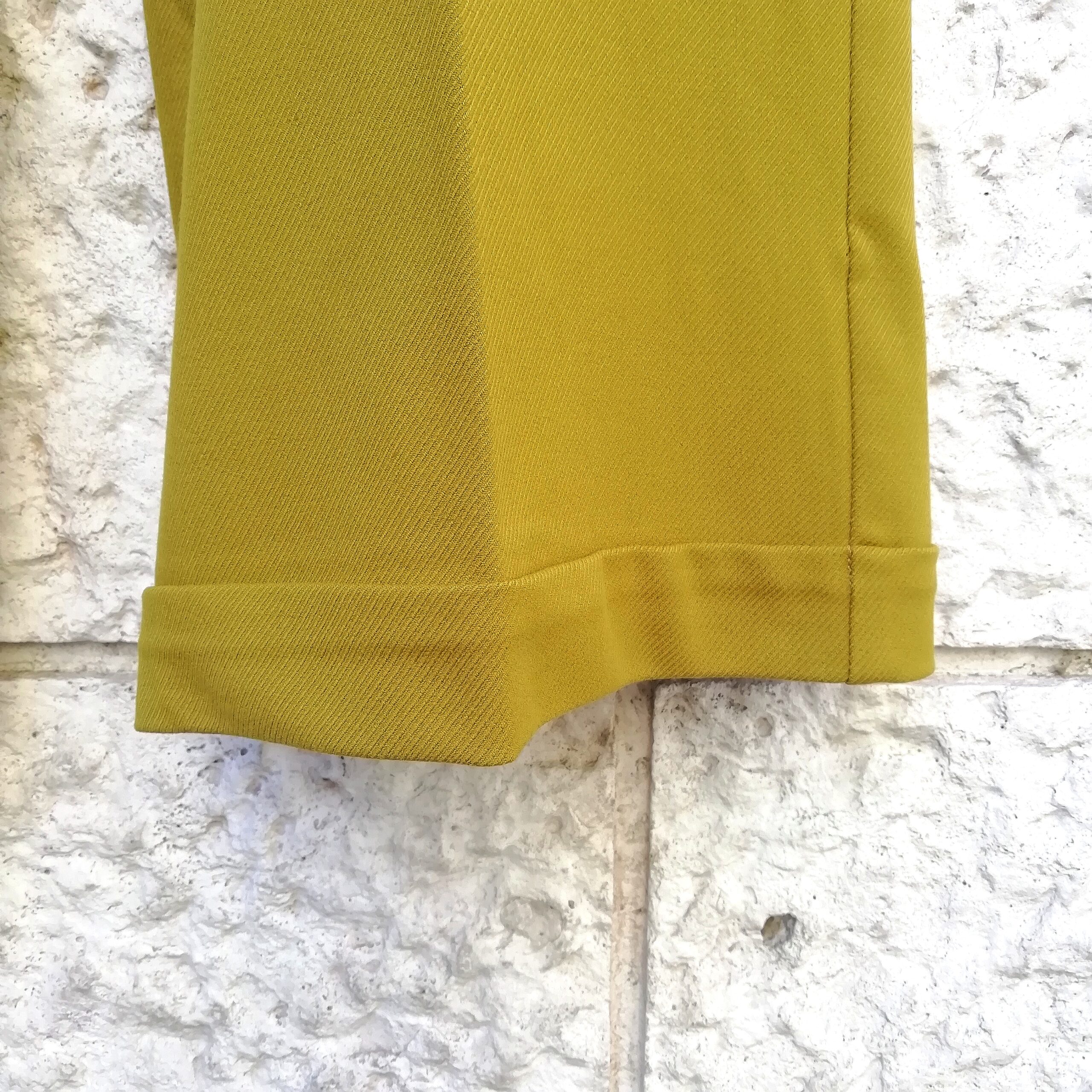 Colore senape. Lunghezza 107 cm. Due tasche. Due tasche posteriori a filetto finte. 62% poliestere, 33% viscosa, 5% elastan. Designed in Holland.