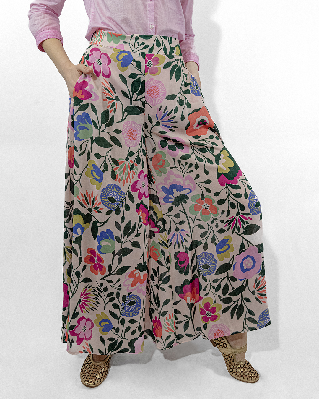 Pantaloni in viscosa con gambe ampie e molto morbide. Vita posteriore elastica. Chiusura laterale con zip nascosta. Due tasche laterali nascoste. 100% viscosa. Produzione artigianale serba.