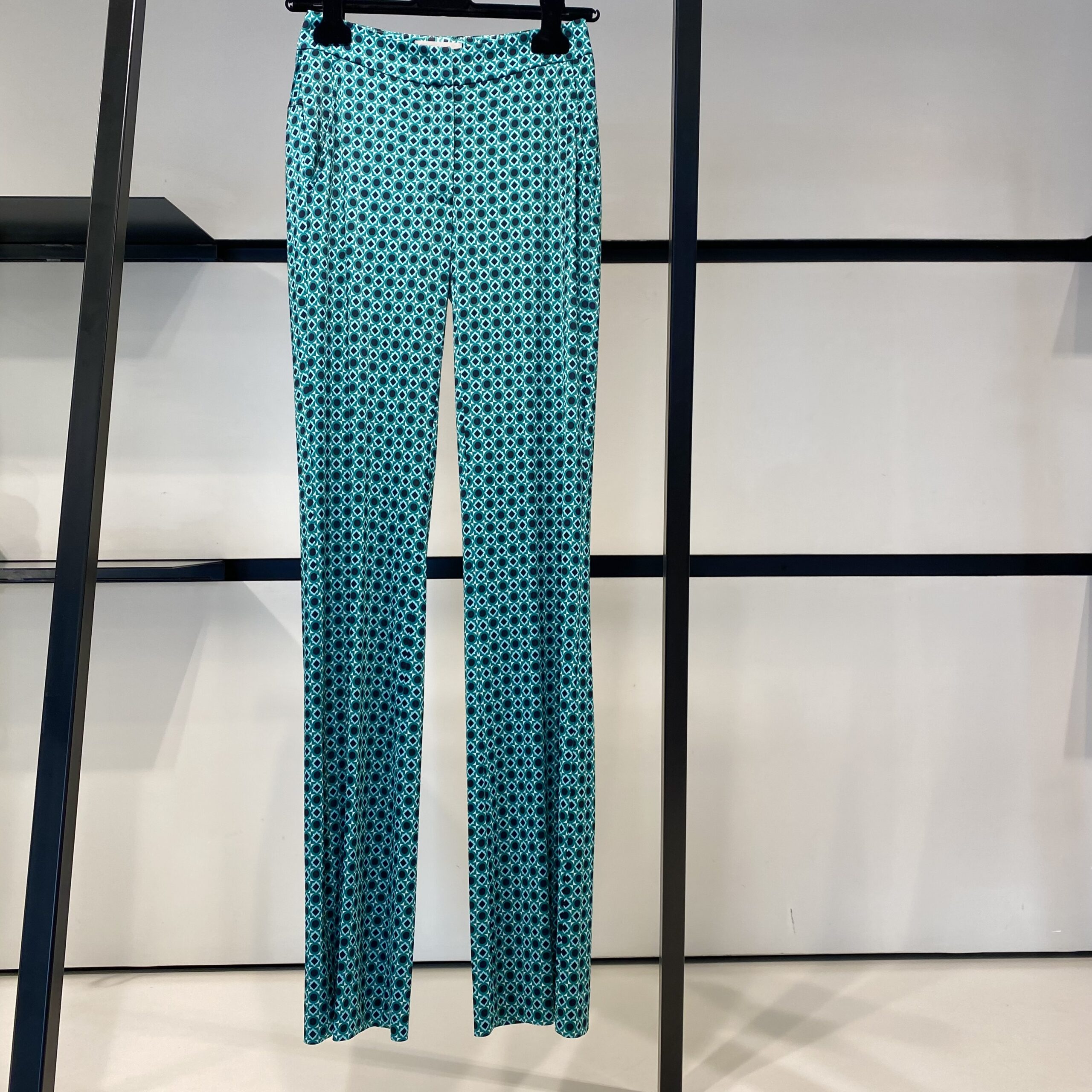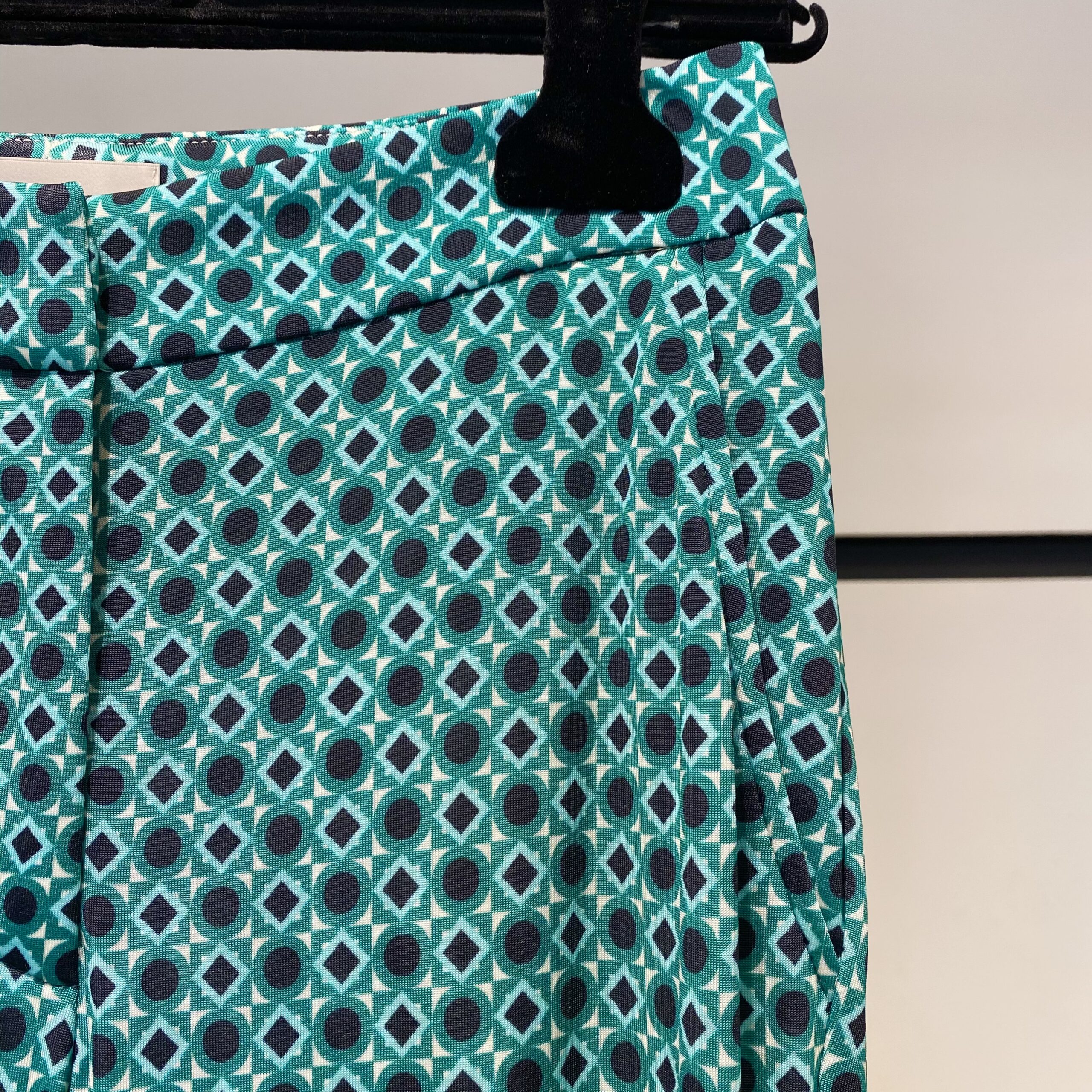 Colore fantasia acquamarina, nero, panna e verde scuro. Lunghezza 114 cm. Zip frontale con piccolo gancetto e bottoncino nascosto. Due tasche laterali. Due tasche a filetto posteriori. 93% viscosa, 7% elastan. Made in Italy.