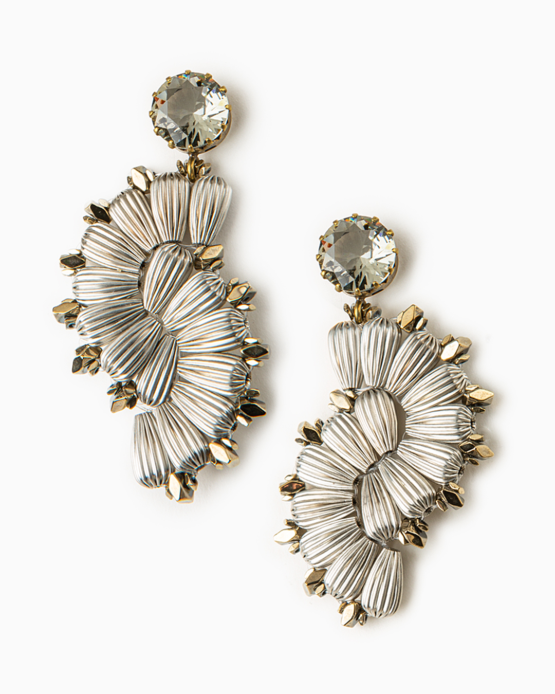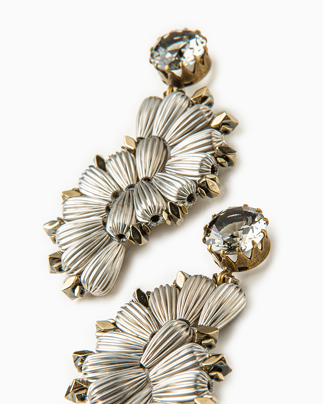 Orecchini con clip caratterizzati da due ventagli realizzati in gocce metalliche rigate e schegge di ematite.