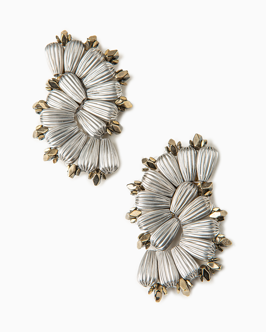 Orecchini con clip caratterizzati da due ventagli realizzati in gocce metalliche rigate e schegge di ematite. Tutti i materiali sono anallergici e nickel free. Produzione artigianale italiana.