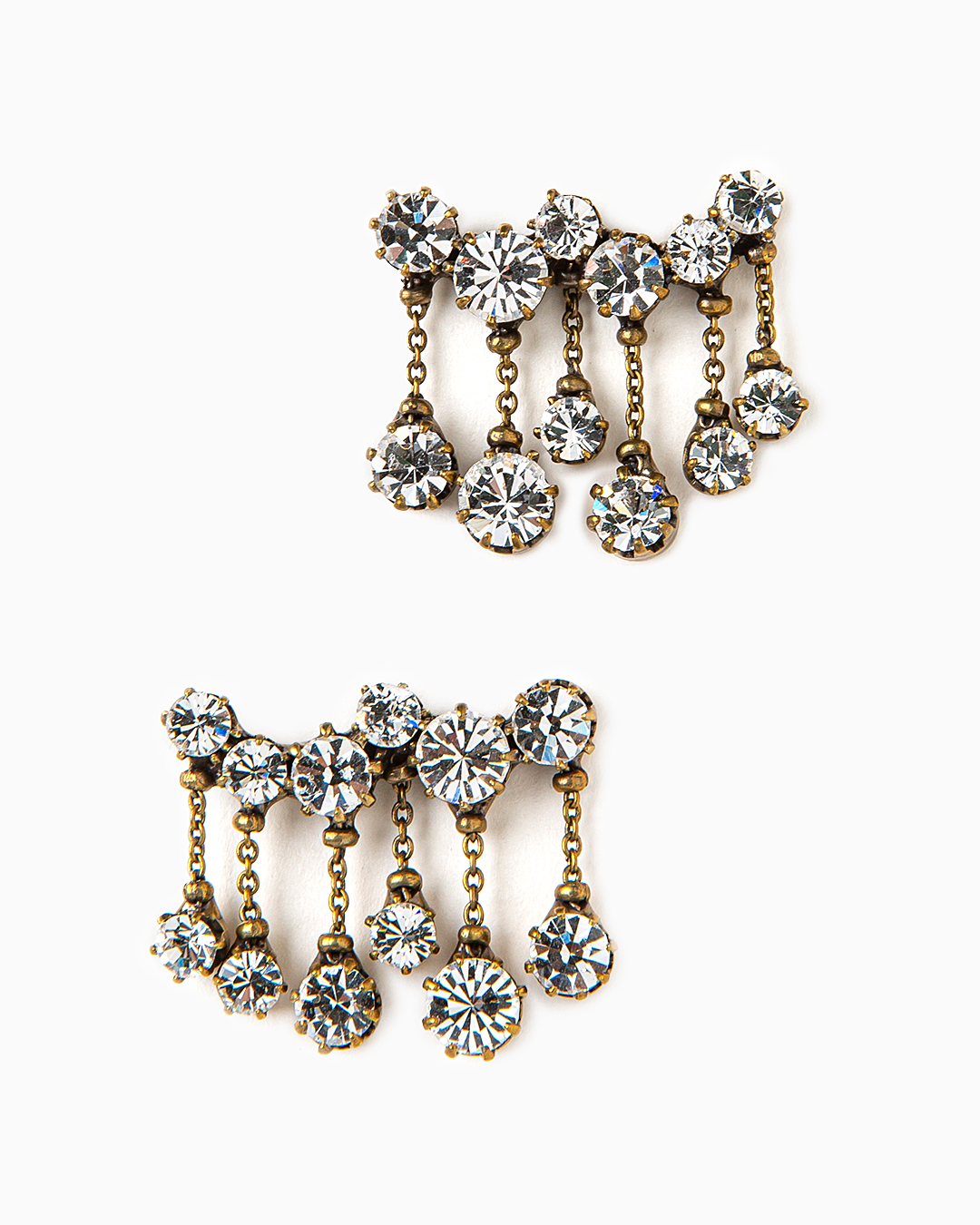 Orecchini caratterizzati da un’alternanza di cristalli grandi e piccoli, impreziositi da una cascata di ciondoli in movimento.