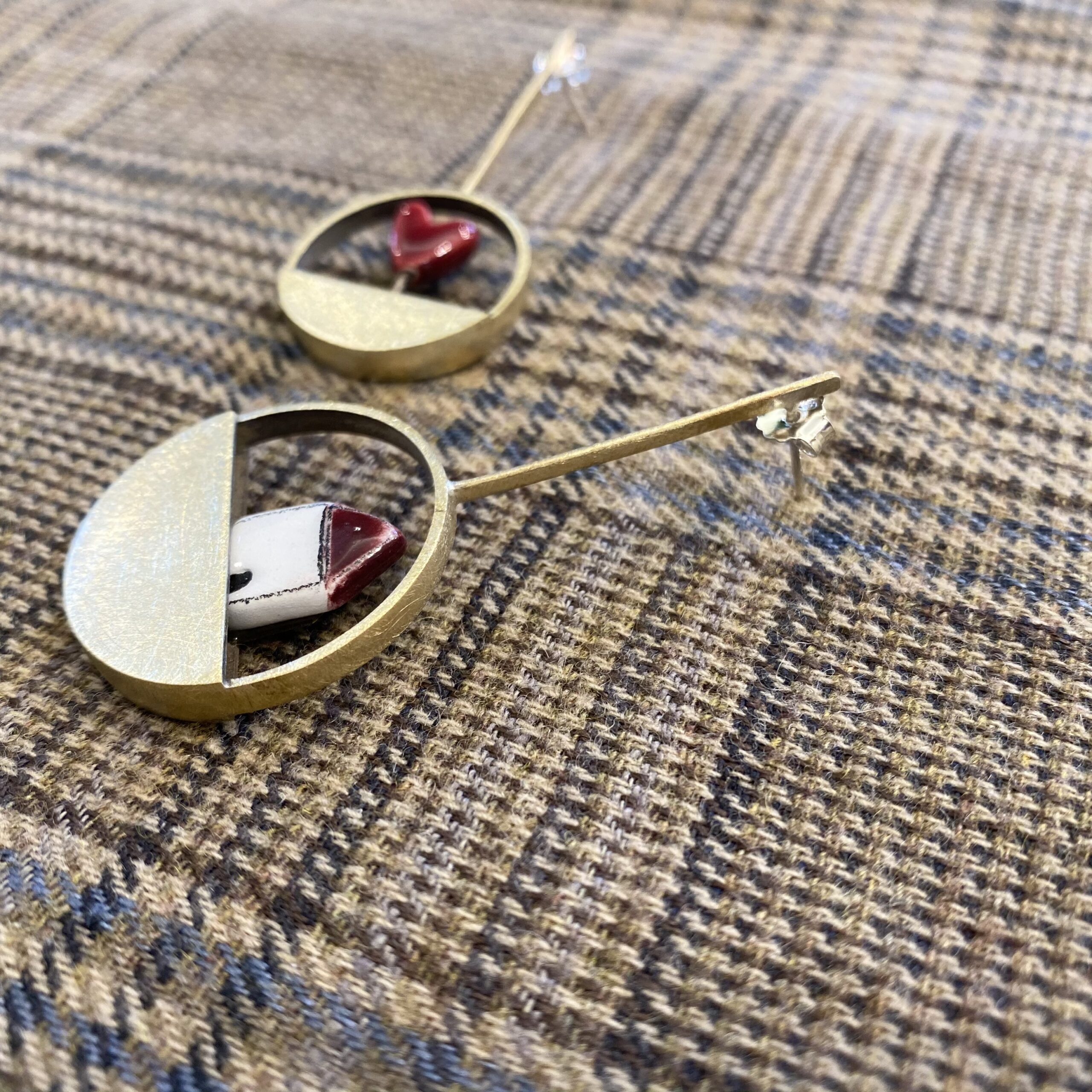 Ottone leggermente graffiato e inserti colorati in argilla dipinta a mano.