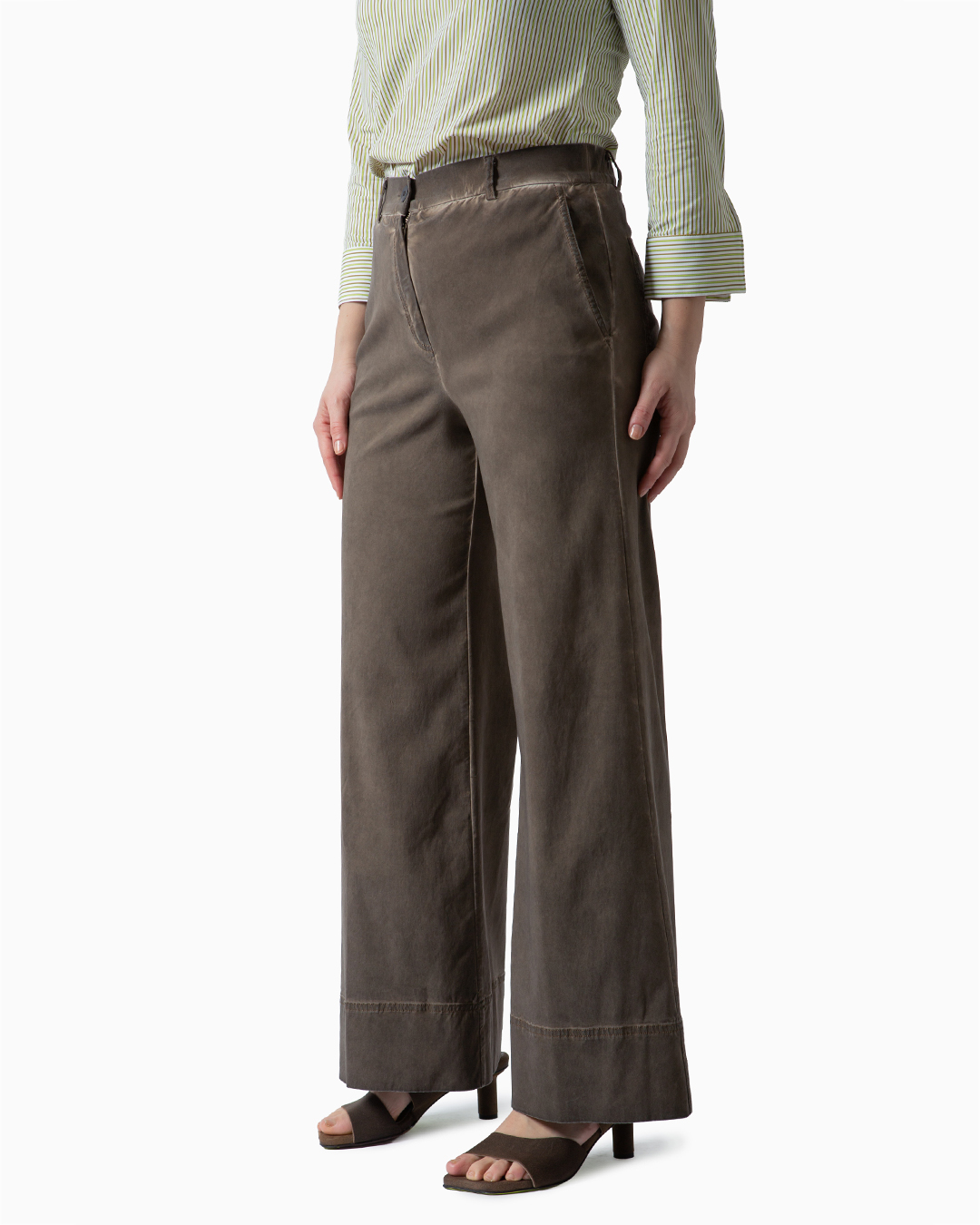Pantalone a vita media e gamba dritta. Tasche a filetto sul davanti e tasche a toppa sul dietro. Chiusura con cerniera e bottone. Composizione: 66% viscosa, 31% nylon, 3% elastan. Made in Italy.