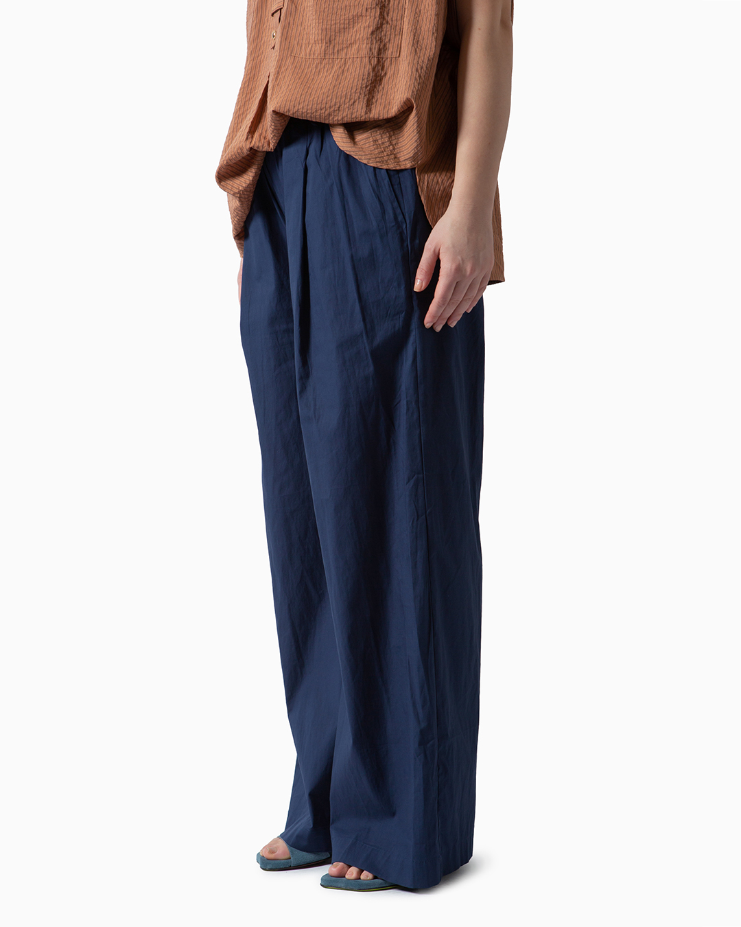 Pantaloni a vita alta elasticizzata e gamba ampia realizzati interamente in cotone. Tasche laterali e pinces sul davanti. Designed in France.