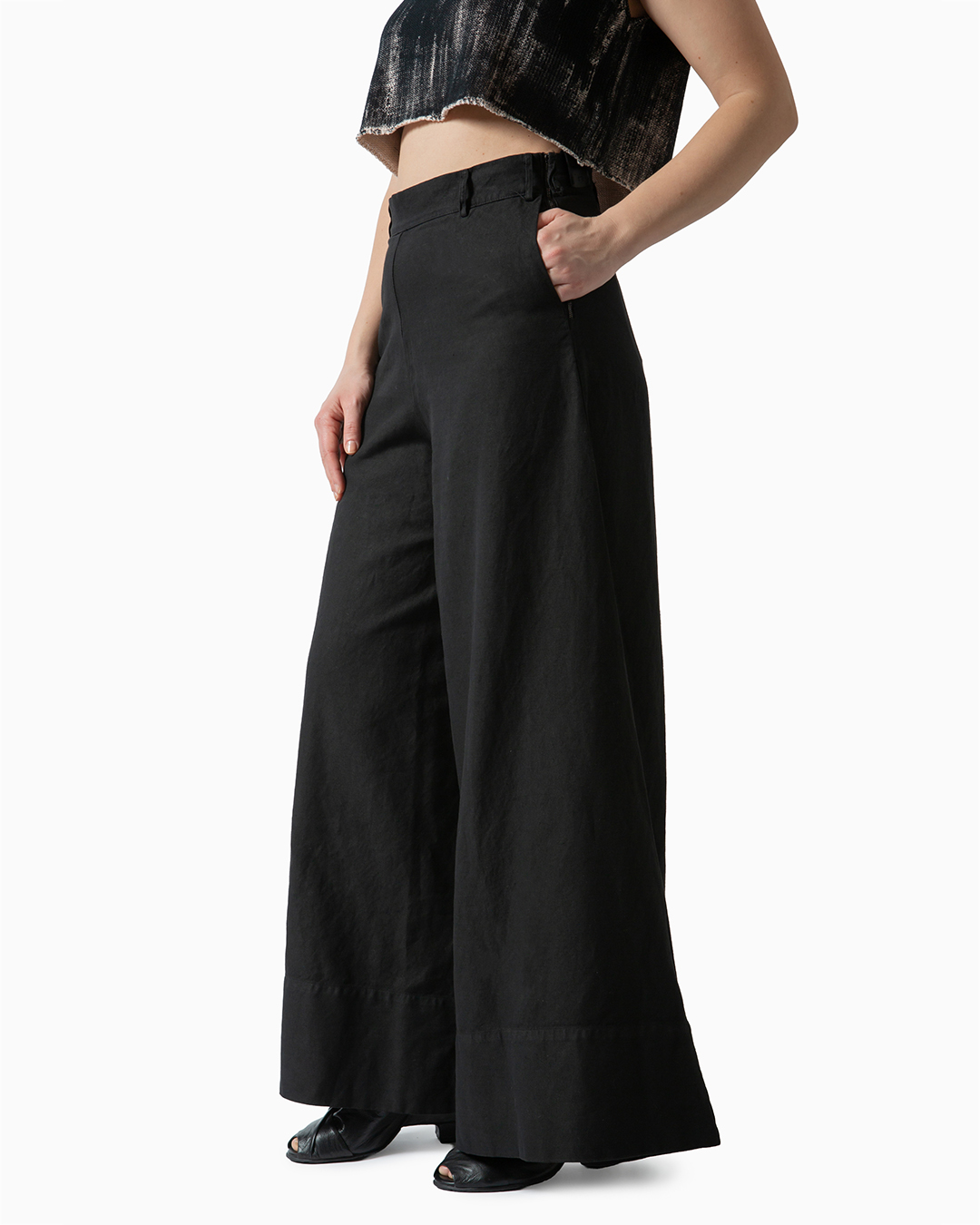 Pantaloni a vita alta e gamba ampia. Cintura con passanti e chiusura laterale con cerniera. Composizione: 74% cotone, 26% lino. Made in Italy.