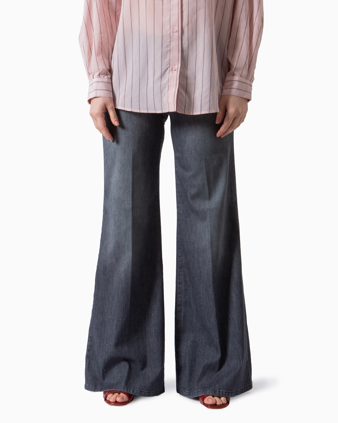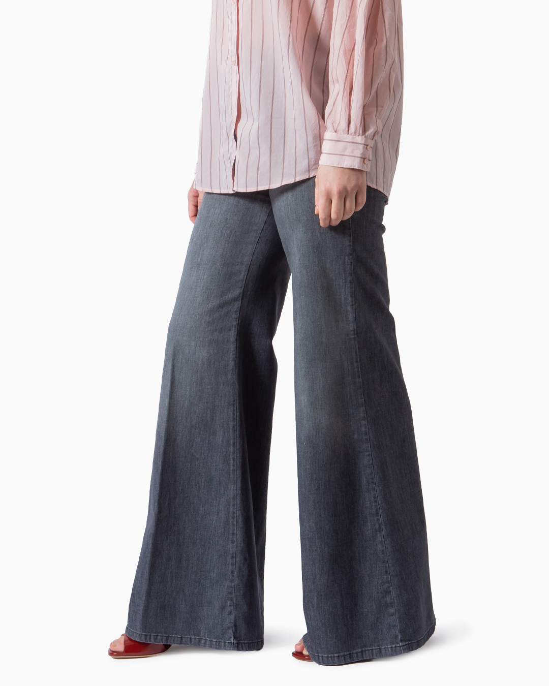 Pantaloni a gamba ampia e svasata. Vita media elasticizzata. Tasche a toppa sul dietro. Chiusura con cerniera e bottone. Composizione: 80% cotone, 12% tencel, 5% eme, 3% elastan. Made in Italy.