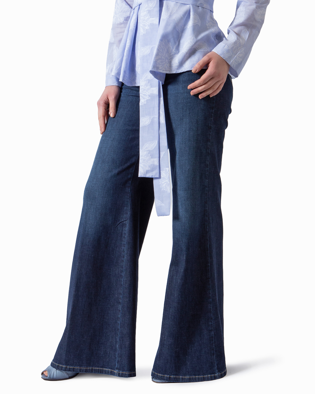 Pantaloni a gamba ampia e svasata. Vita media elasticizzata. Tasche a toppa sul dietro. Chiusura con cerniera e bottone. Composizione: 80% cotone, 12% tencel, 5% eme, 3% elastan. Made in Italy.