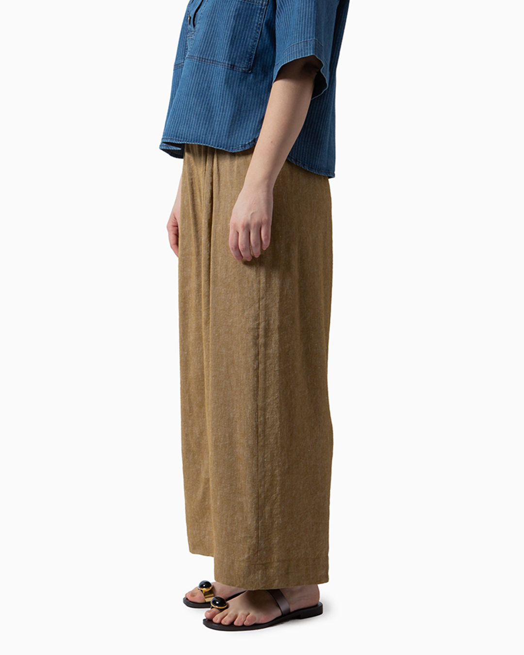 Pantaloni ampi con vita elasticizzata in morbido twill di viscosa e lino. Tasche inserite nelle cuciture laterali. Pieghe piatte sotto la vita. Composizione: 50% Viscosa 50% Lino. Designed in France.