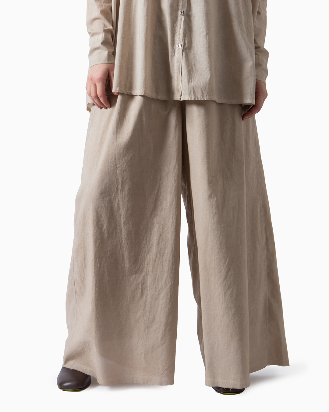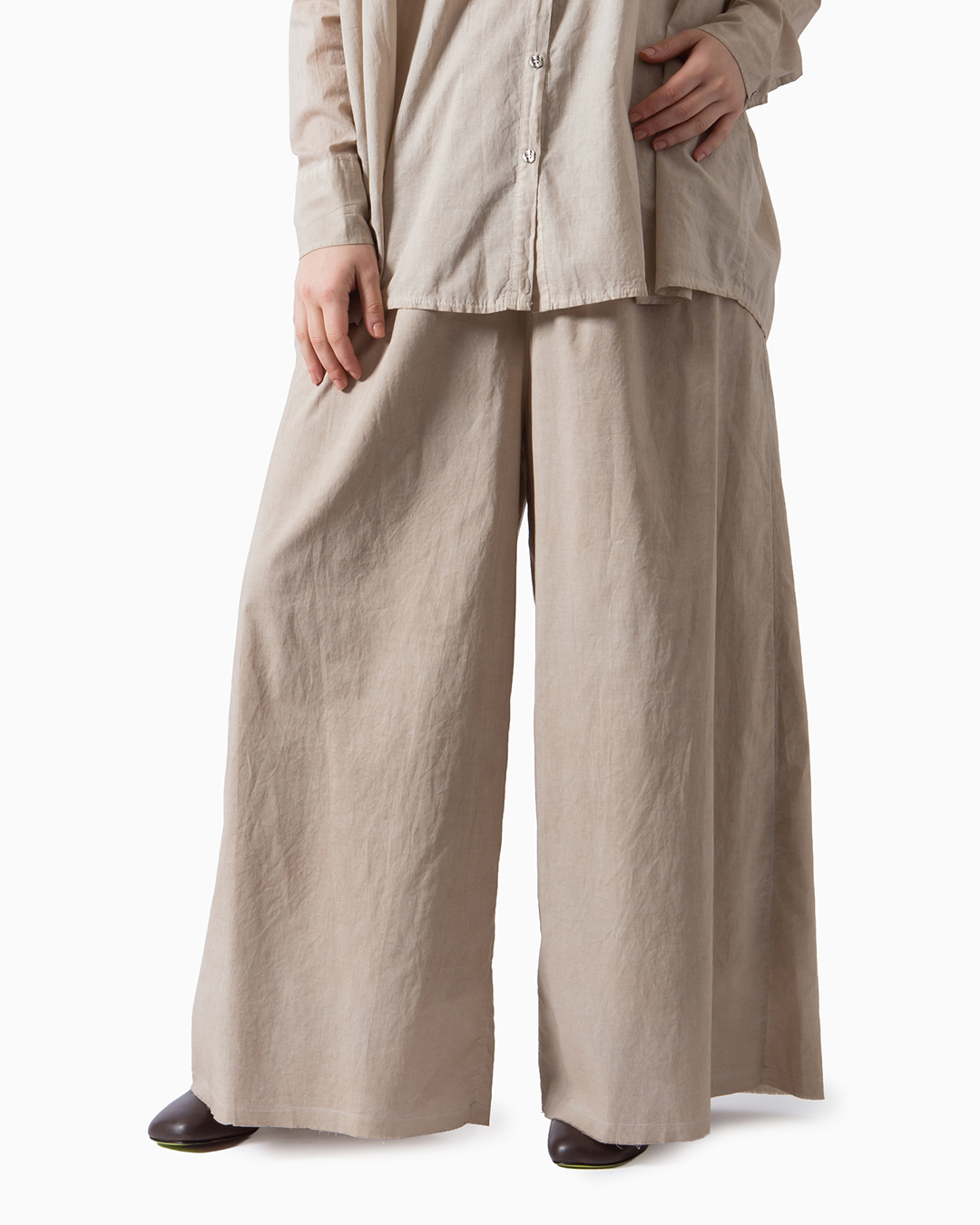 Pantaloni dalla linea ampia a palazzo in mussola di cotone e seta doppiata. Vita elastica e tasche laterali. Composizione: 100% cotone. Made in Italy.