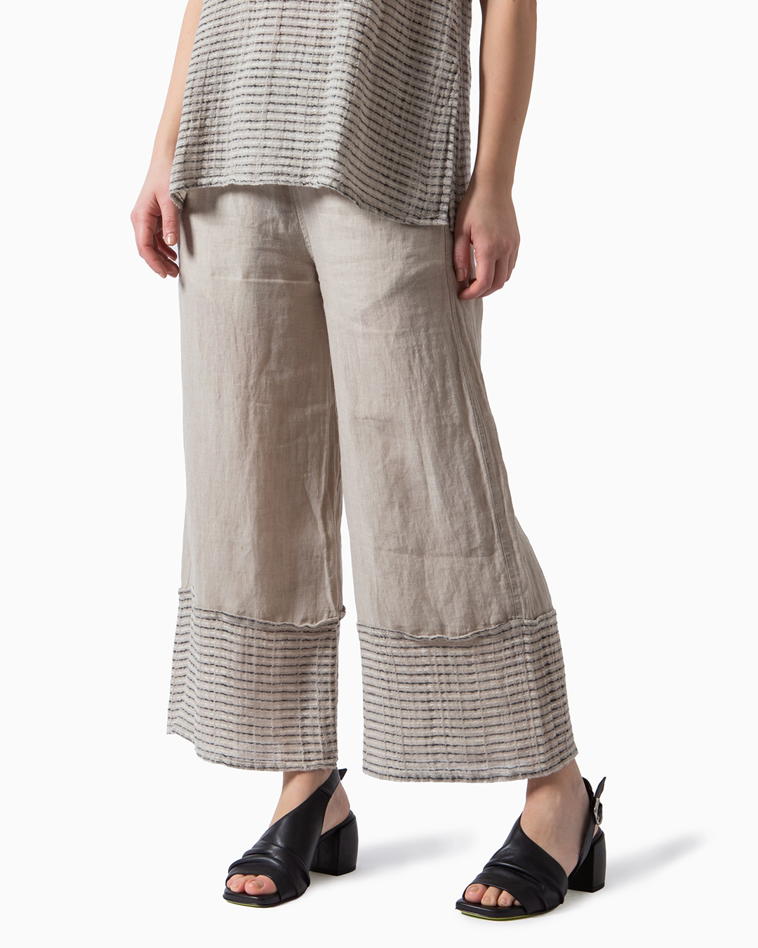 Pantaloni realizzato in lino naturale. Gamba ampia e vita elastica. Tasche laterali. Made in Italy.