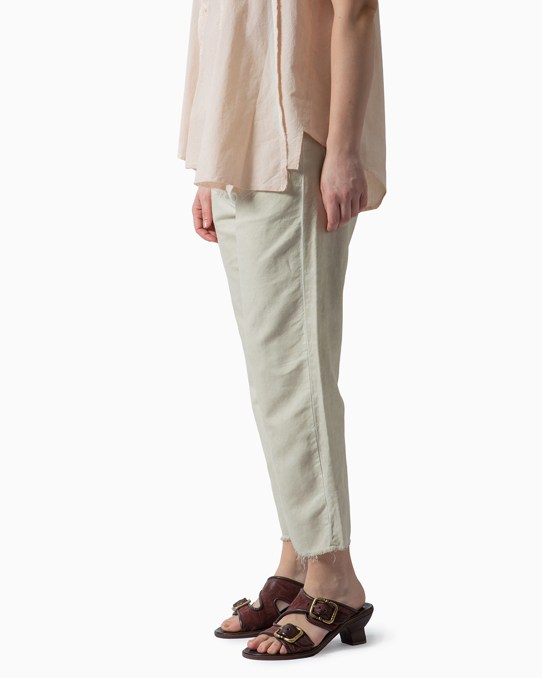 Pantaloni a vita media e gamba dritta, tinti a freddo. Cinturino con passanti e chiusura con bottoni. Composizione: 74% cotone, 26% lino. Made in Italy.