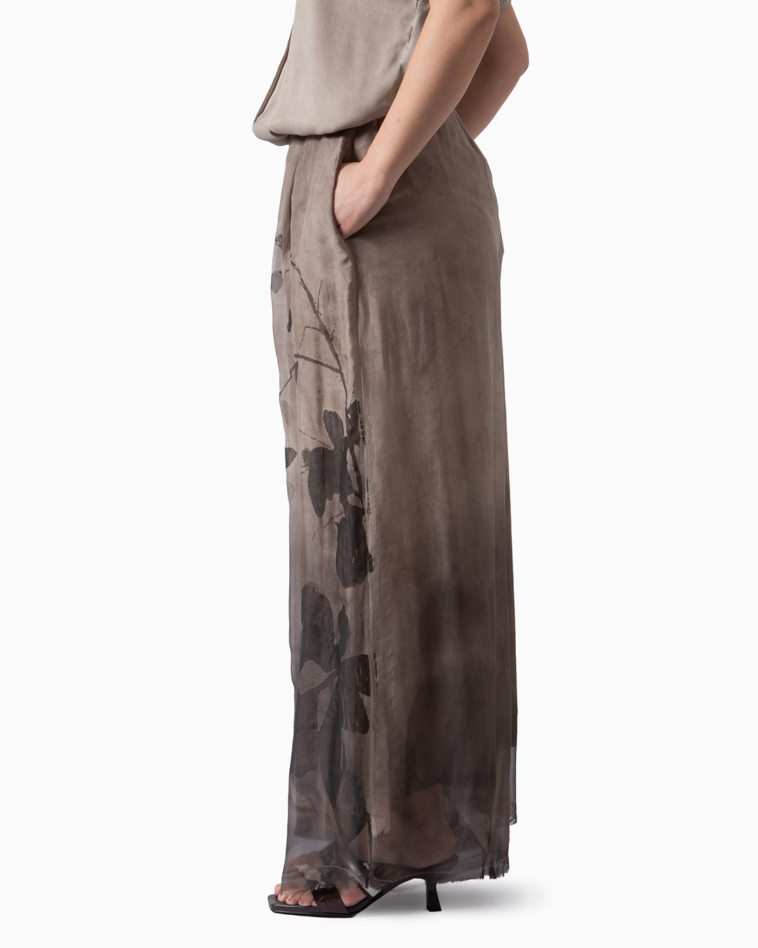 Pantaloni a palazzo in viscosa e seta. Foderato con mussola di cotone. Sfumato a mano con aerografo effetto degradè e stampa floreale. Made in Italy.