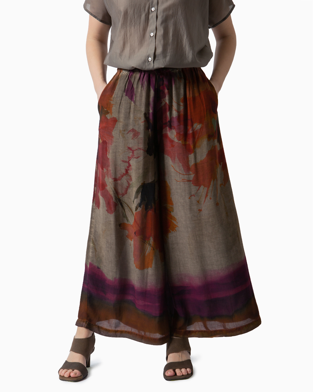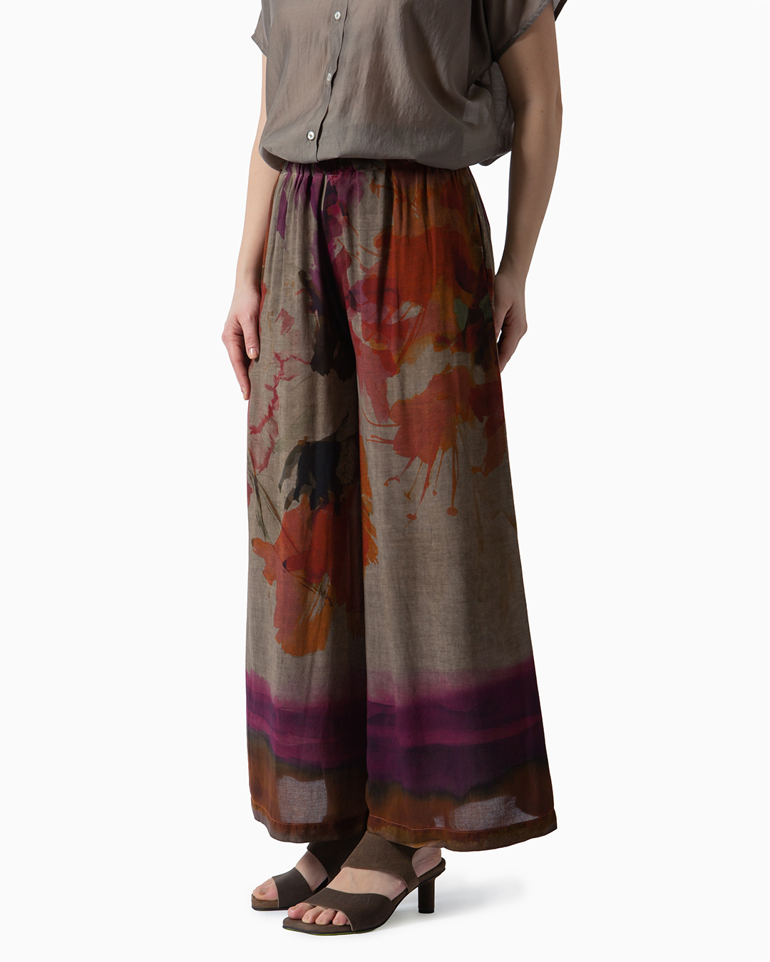 Pantaloni dalla linea fluida con stampa floreale. Elastico in vita e gamba ampia. Composizione: 100% viscosa. Made in Italy.