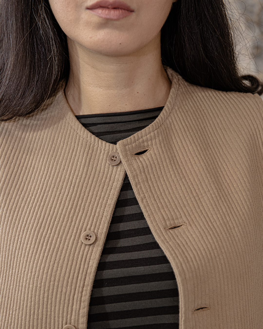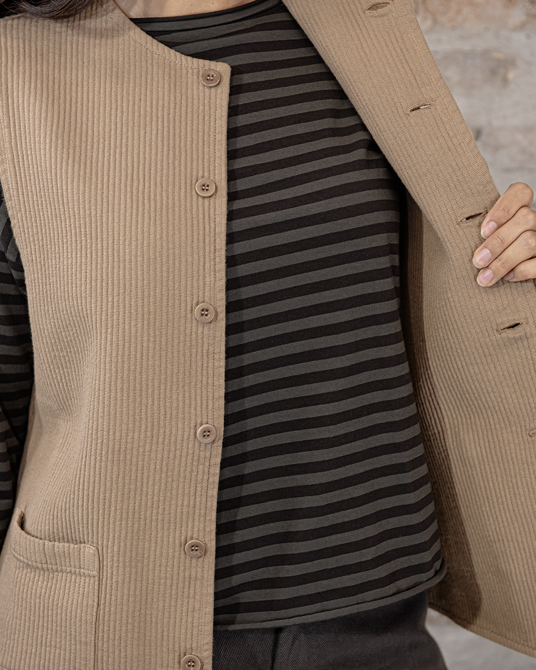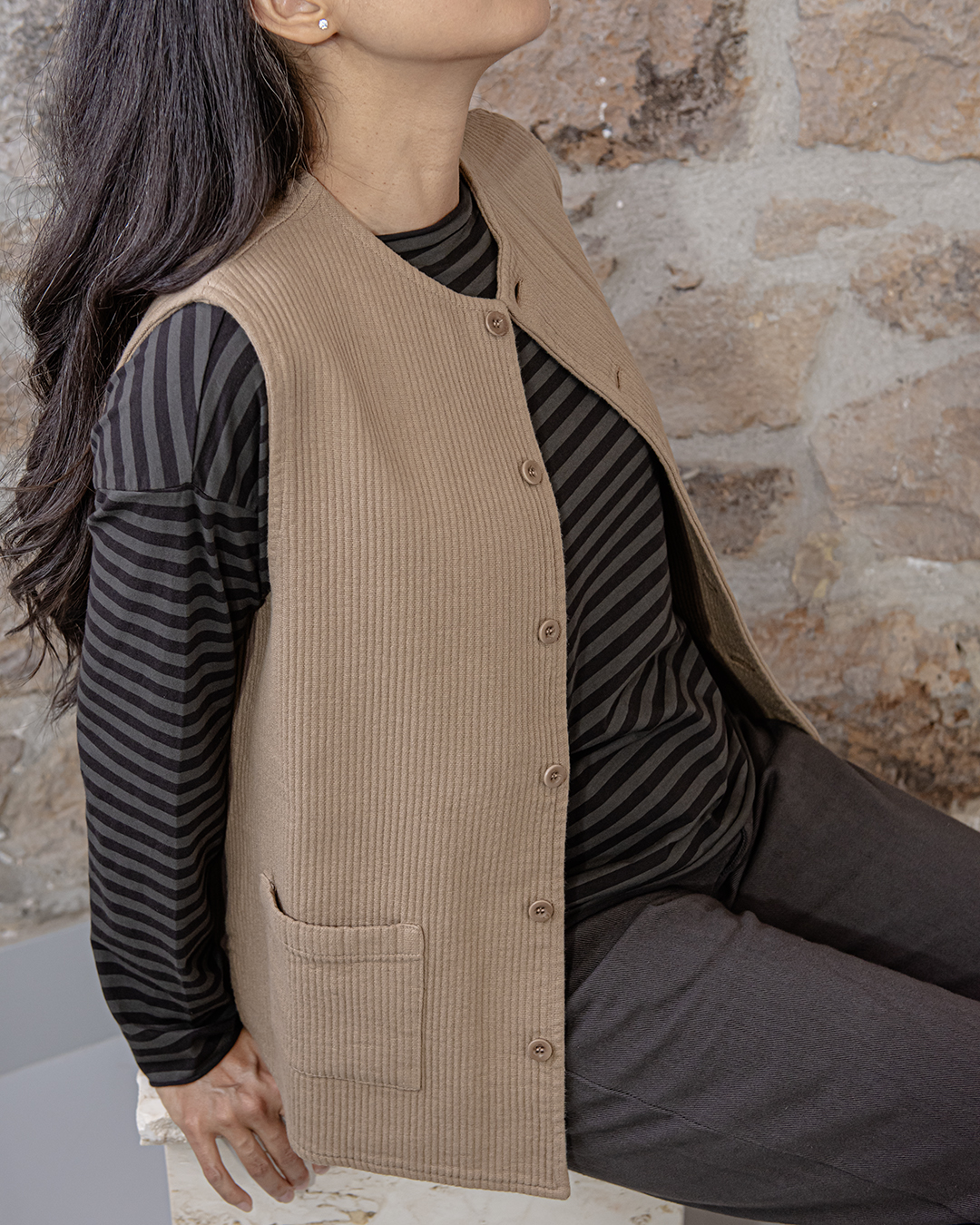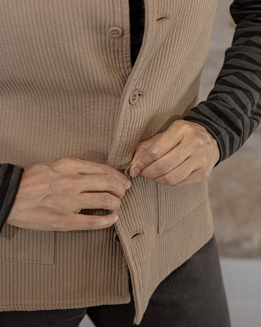 Gilet modello Sam di Labo Art con bottoni, scollo tondo.