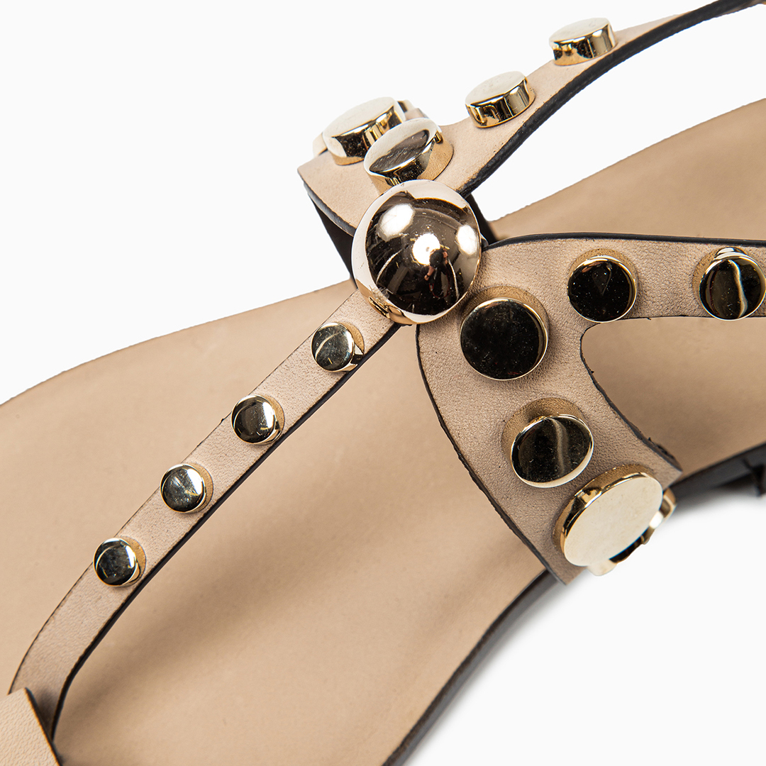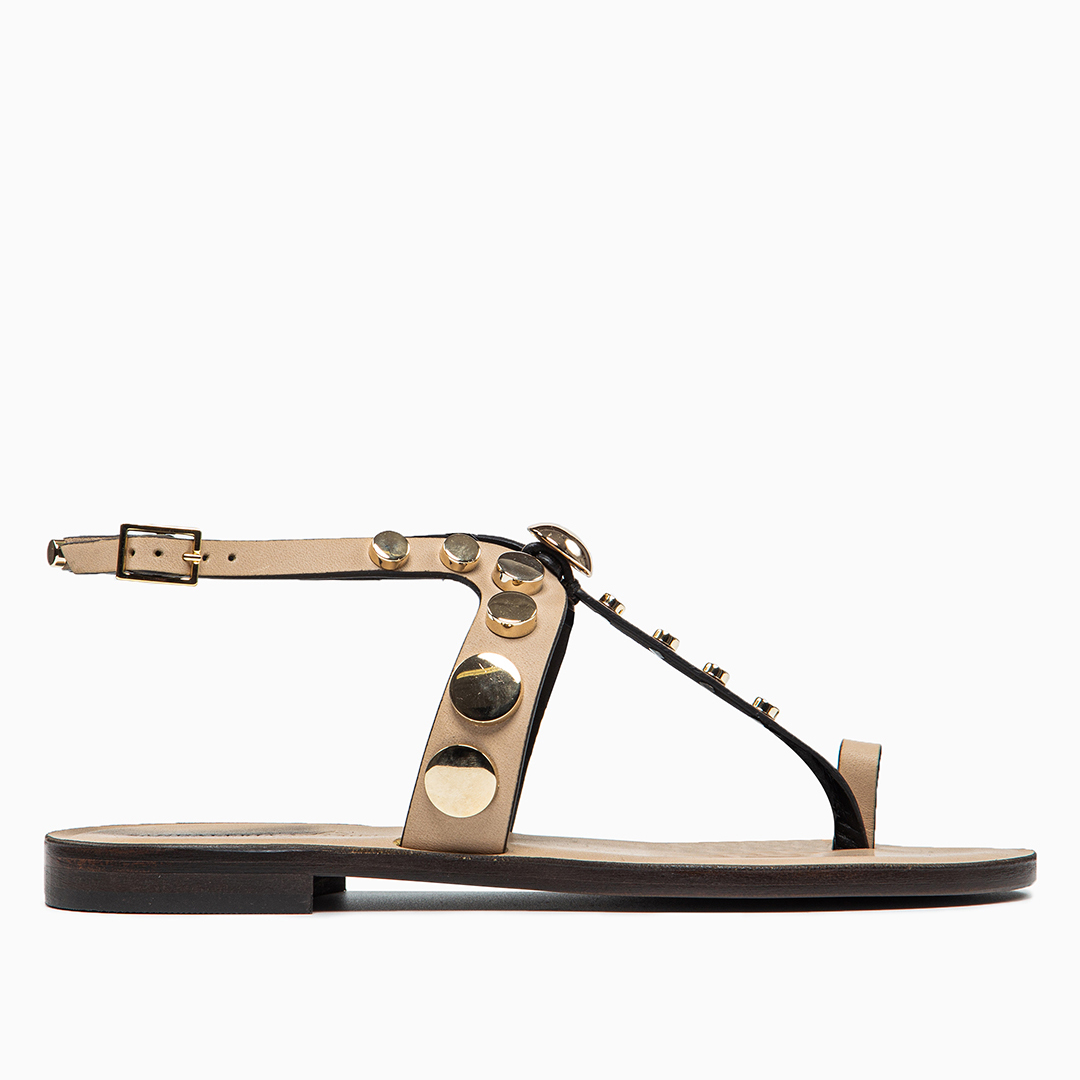 Sandalo in pelle color tortora con borchie sulla tomaia. Altezza tacco 2 cm. Realizzato artigianalmente in Italia.