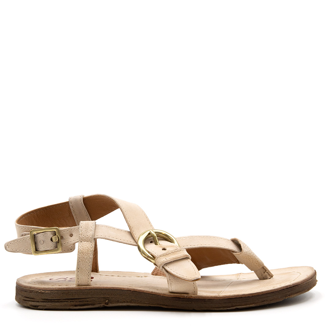 Infradito con fascia incrociata alla caviglia. con doppia fibbia in metallo regolabile. Tomaia interna in pelle, esterna in pelle. Suolettino interno in pelle. Fondo esterno in gomma. Colore: sabbia. Tacco: 1,5 cm. Made in Italy.