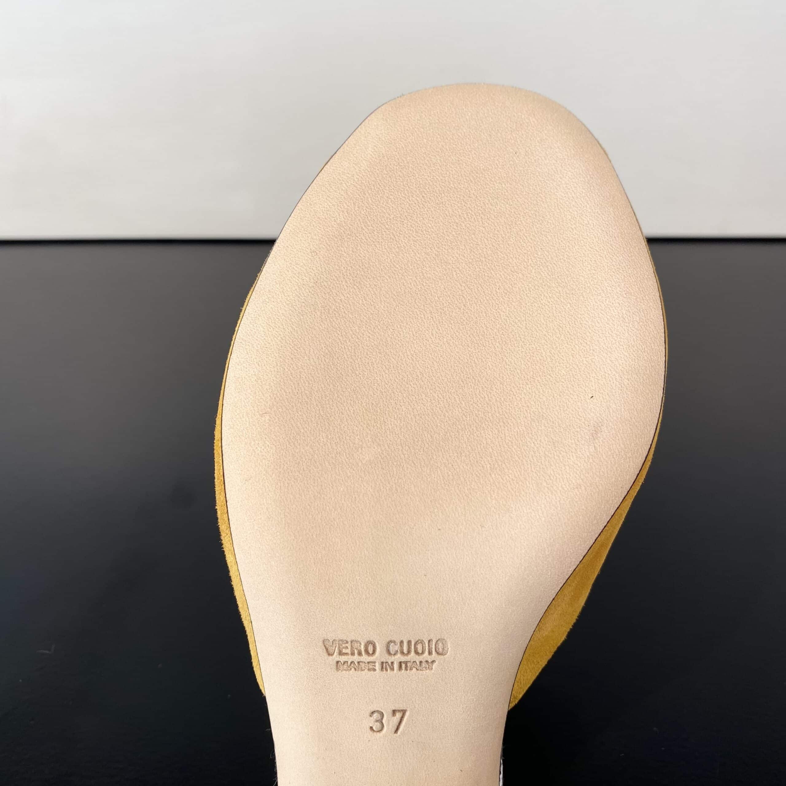 Suolettino interno in pelle imbottita e parte anteriore in rafia spigata.