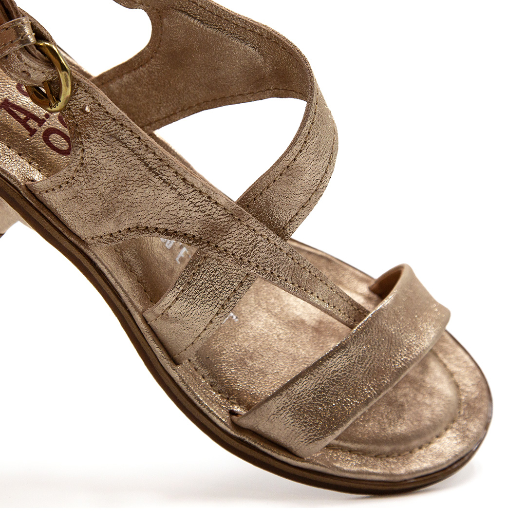 Sandalo infradito con cinturino regolabile con fibbia in metallo. Tomaia interna in pelle, esterna in pelle. Suolettino interno in pelle. Fondo esterno in gomma. Colore: oro. Tacco: 6 cm foderato in pelle. Made in Italy.