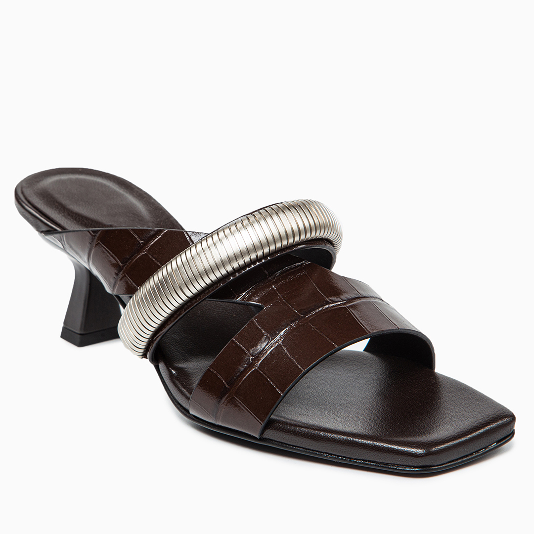 Sandalo in pelle stampata color fondente. Dettaglio gioiello metallico sulla tomaia. Altezza tacco 5 cm. Realizzato artigianalmente in Italia.