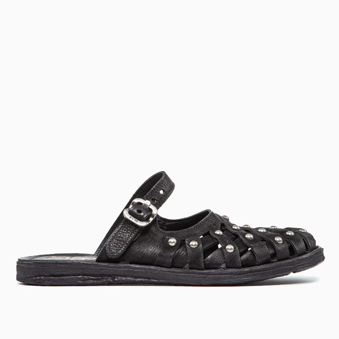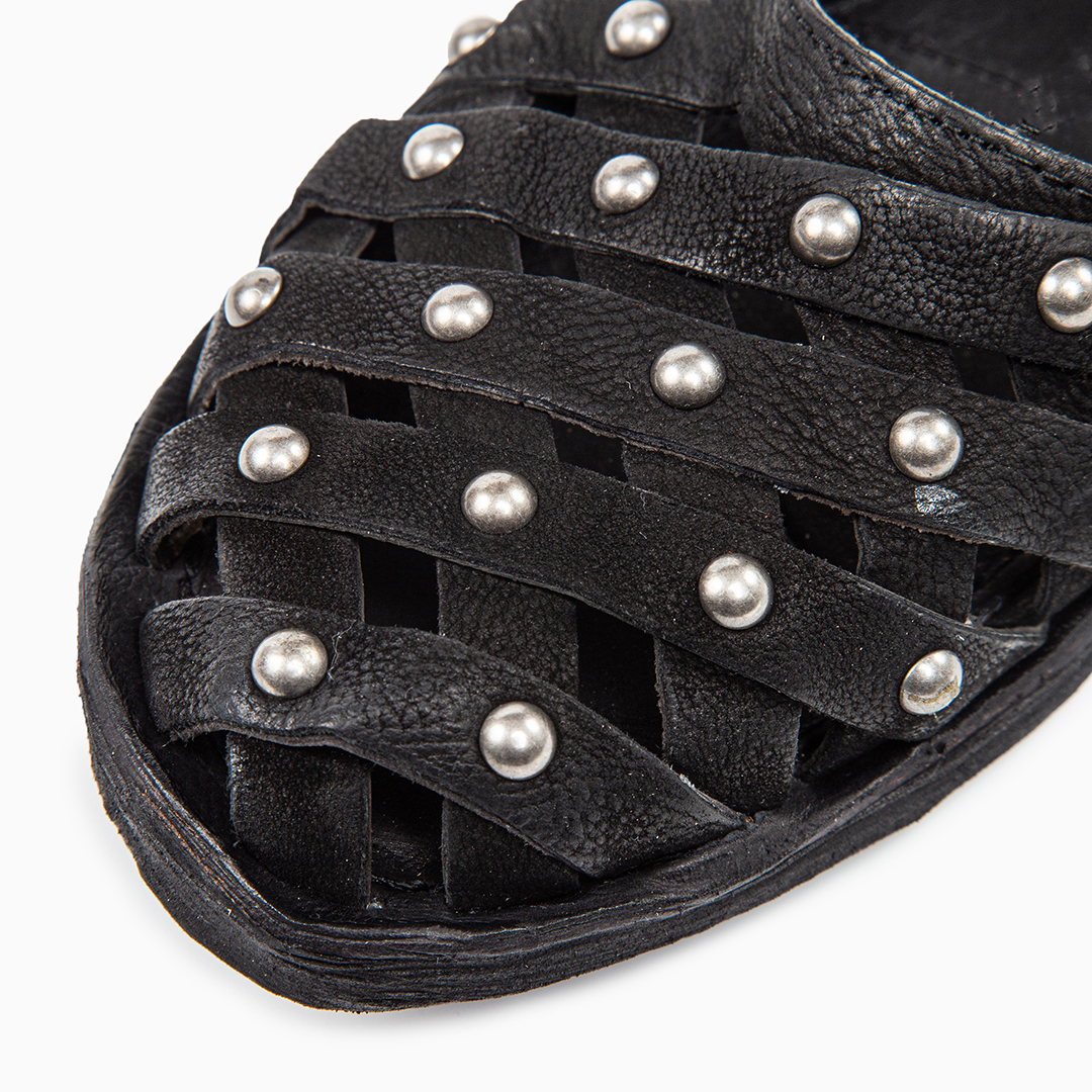 Sandalo con suola flat in morbida pelle nera. Tomaia intrecciata con borchie metalliche e cinturino regolabile con fibbia. Il sottopiede è imbottito e morbido. Altezza tacco 2 cm. Produzione artigianale italiana.