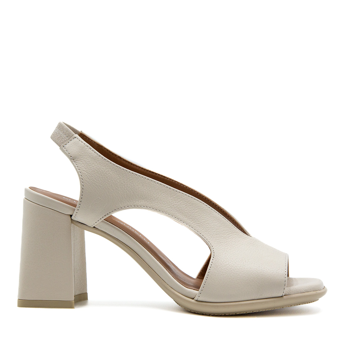 Sandalo con scollo a V. Cinturino dietro con fascia elastica. Tomaia interna in pelle, esterna in pelle. Suolettino interno in pelle. Fondo esterno in pelle. Colore: latte. Tacco: 8,5 cm foderato in pelle. Made in Italy.