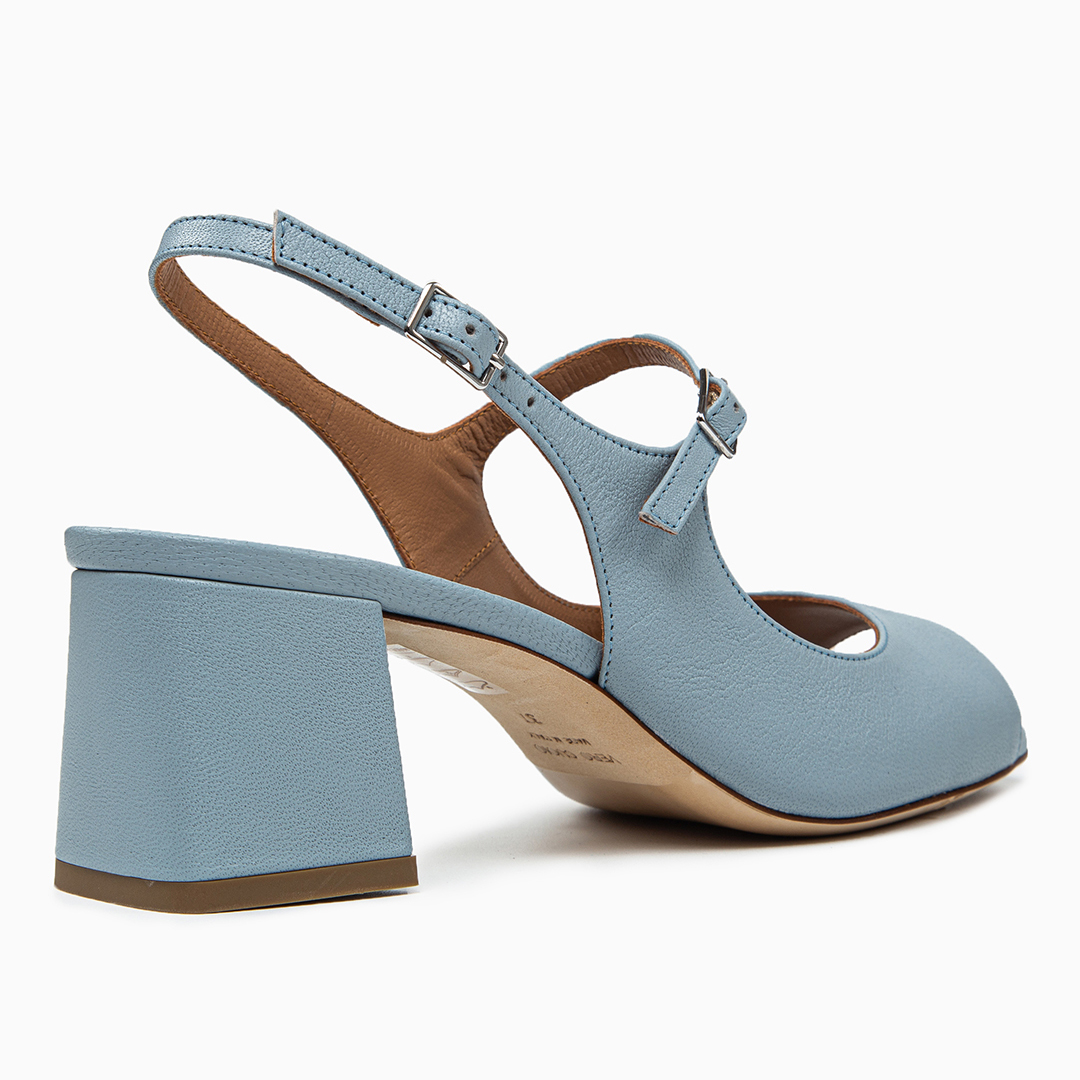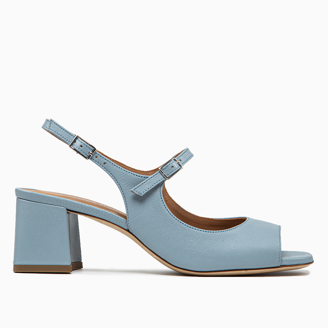 Sandalo in pelle color ceruleo. Tomaia con cinturino regolabile. Chiusura con cinturino posteriore. Altezza tacco 5 cm. Made in Italy.