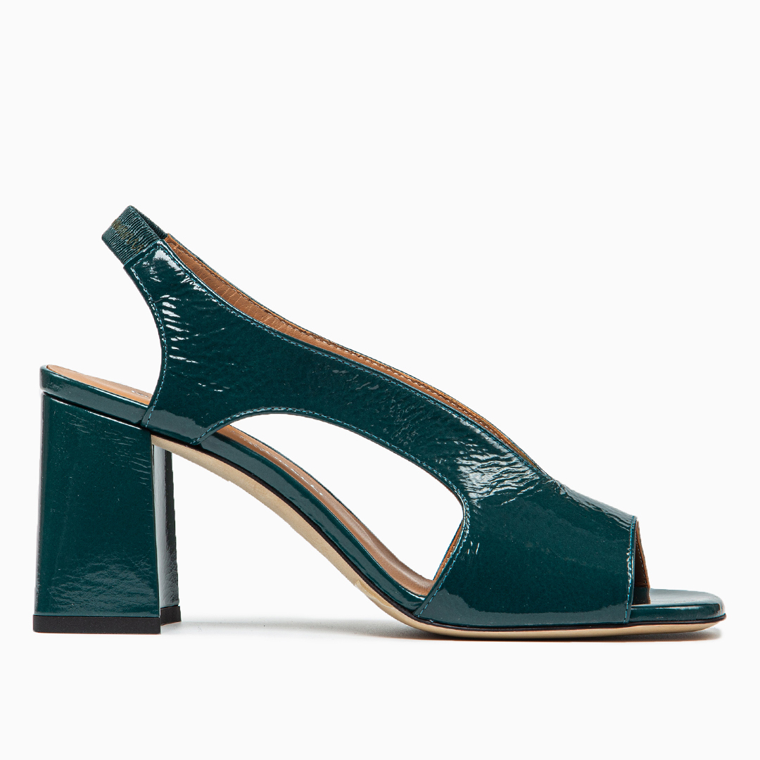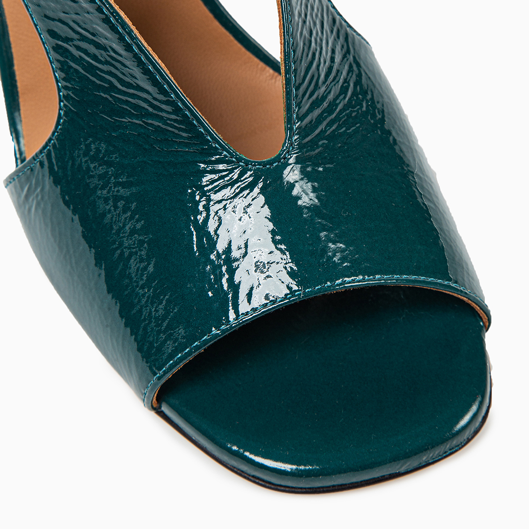 Sandalo in pelle lucida color petrolio.