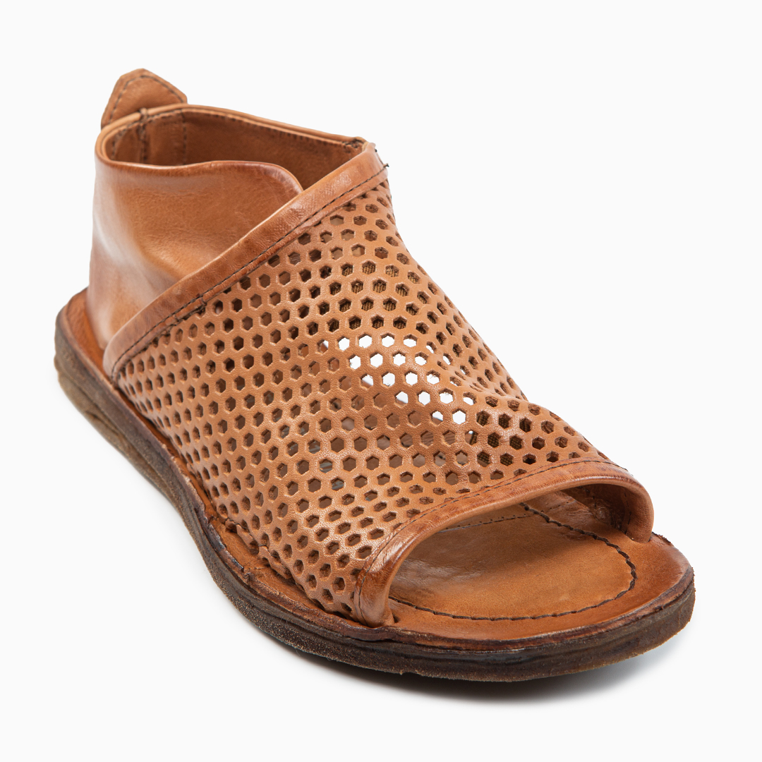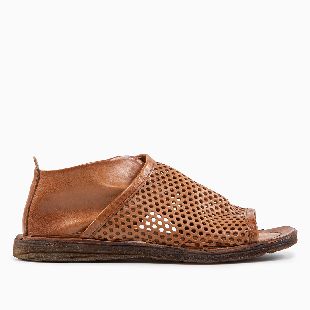 Sandalo semiaperto in pelle traforata. Dettaglio tomaia intrecciata. Altezza tacco 2 cm. Produzione artigianale italiana.