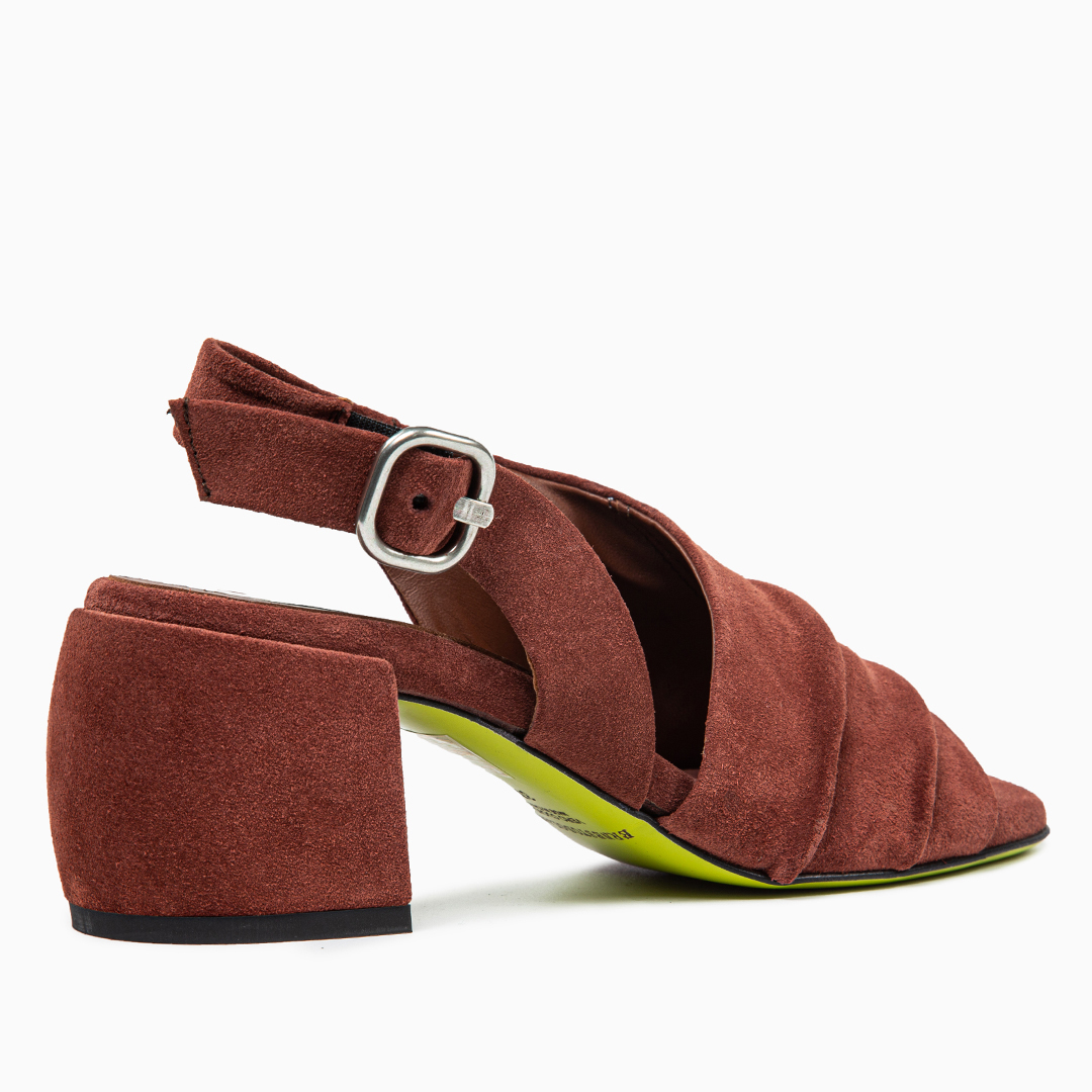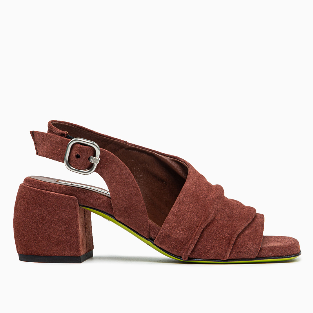Sandalo in pelle di camoscio color mattone. Dettaglio tomaia drappeggiata e punta quadrata. Altezza tacco 6 cm. Made in Italy.