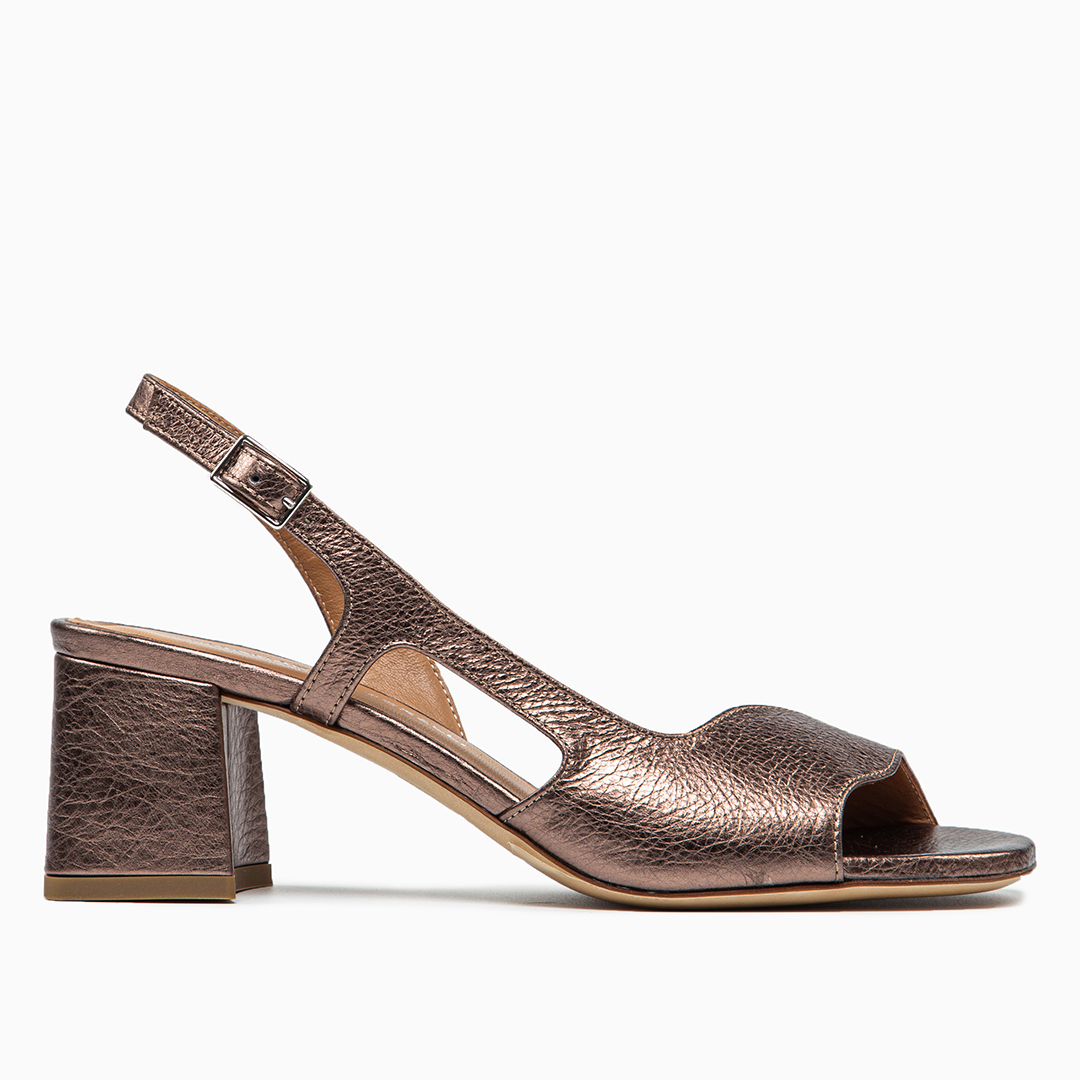 Sandalo in pelle color bronzo. Chiusura con cinturino. Altezza tacco 5 cm. Made in Italy.