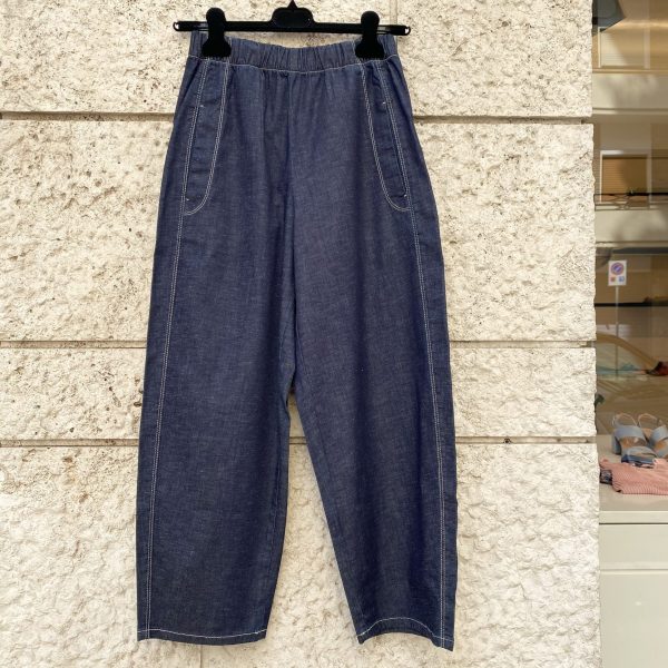 Colore denim. Lunghezza 91 cm. Fascia elastica in vita. Due tasche laterali. Due tasche posteriori. Si può indossare sia con risvolto che senza. 88% cotone, 10% lino, 2% elastan. Made in Italy.