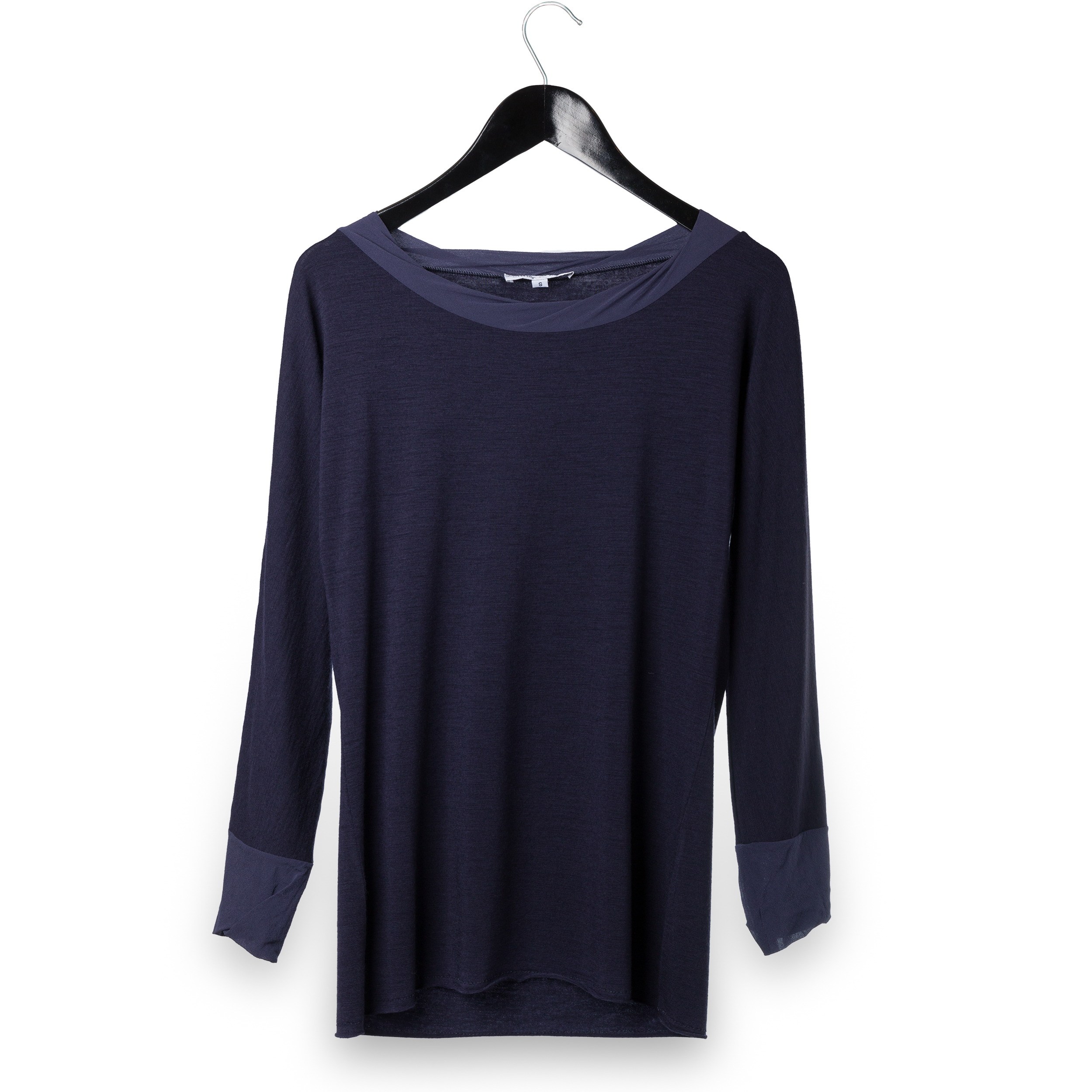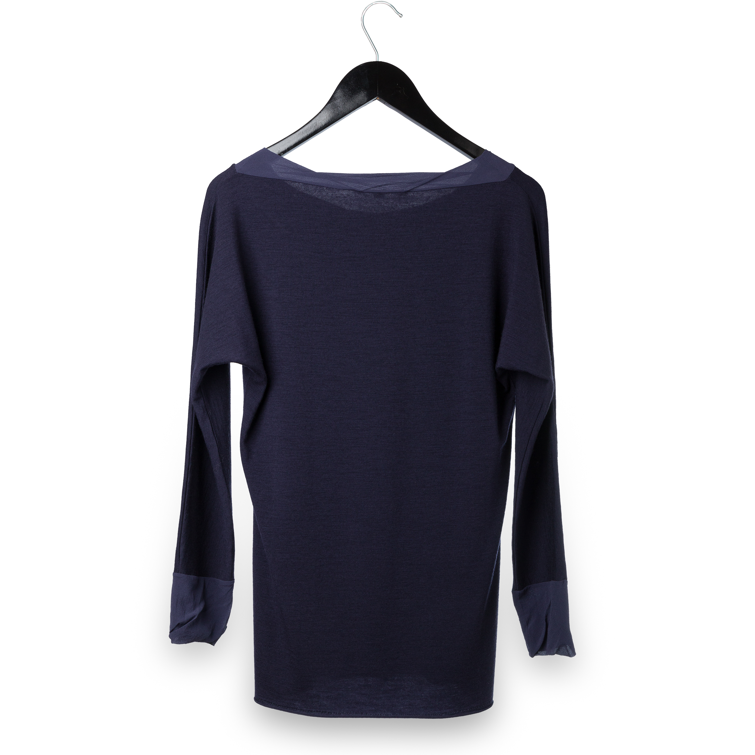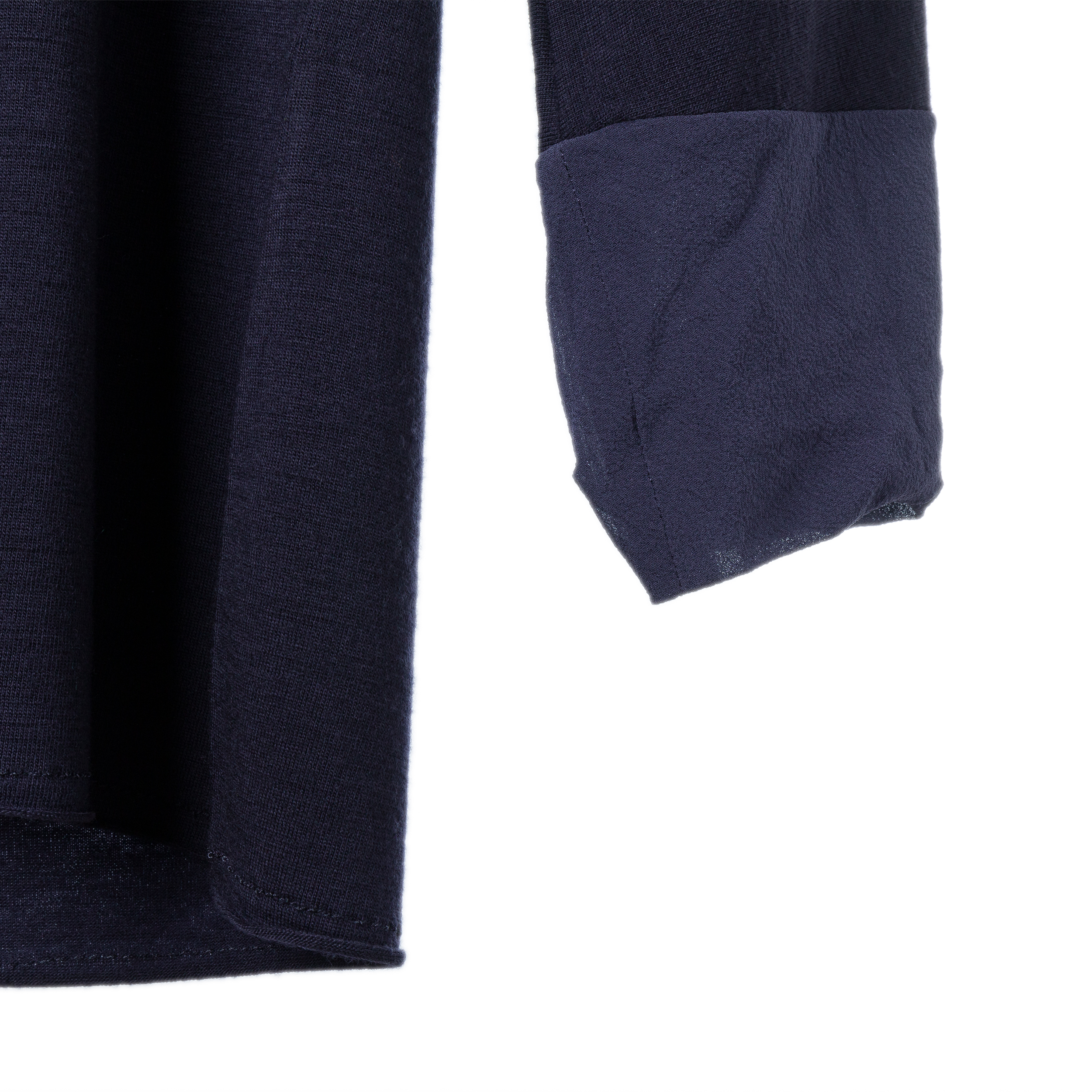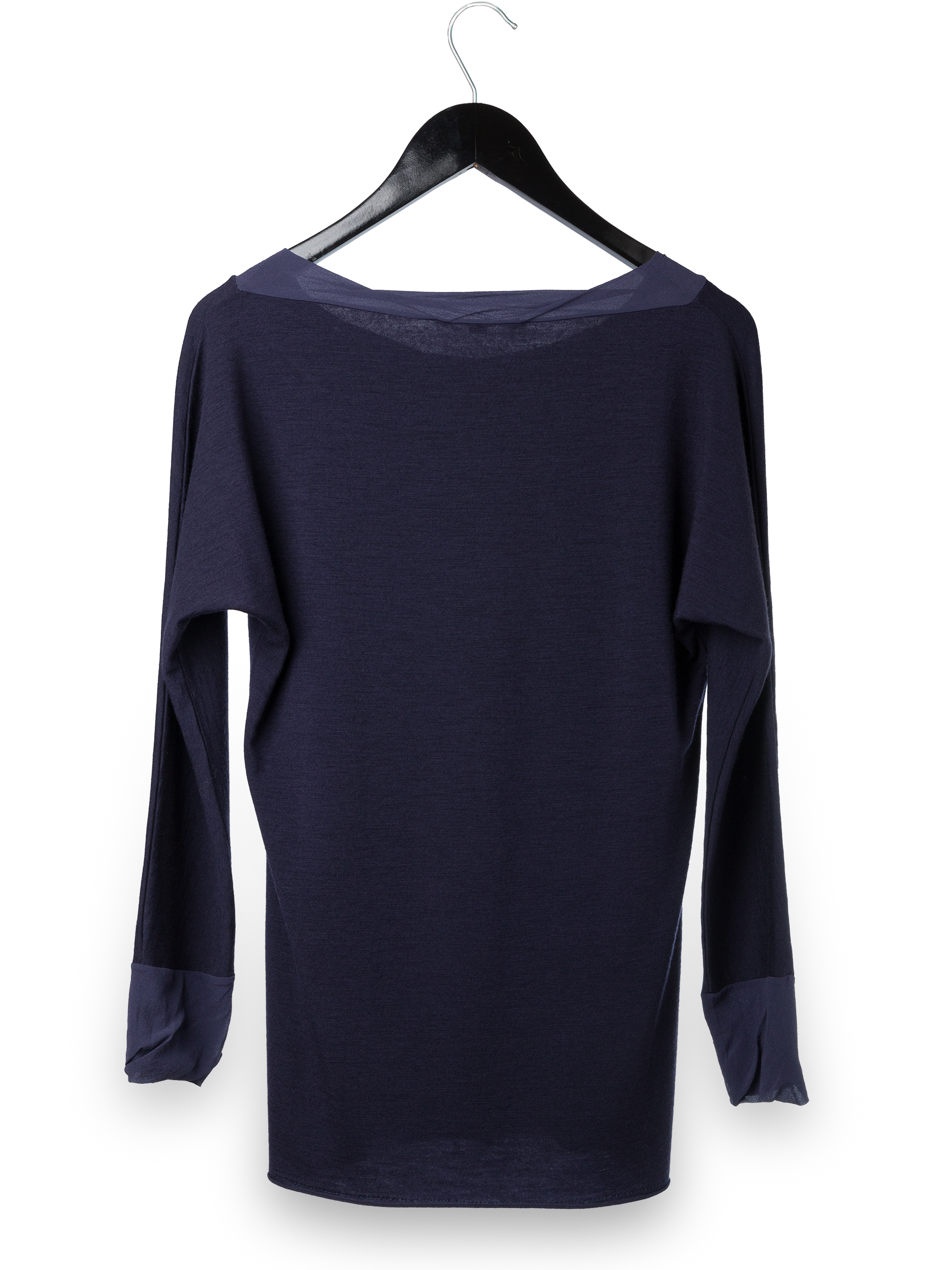 Il girocollo e i polsini sono in seta, la lavorazione del bagno di colore è la stessa, ma i tessuti differenti assorbono la tintura in modo diverso, creando un bellissimo effetto bicromatico.