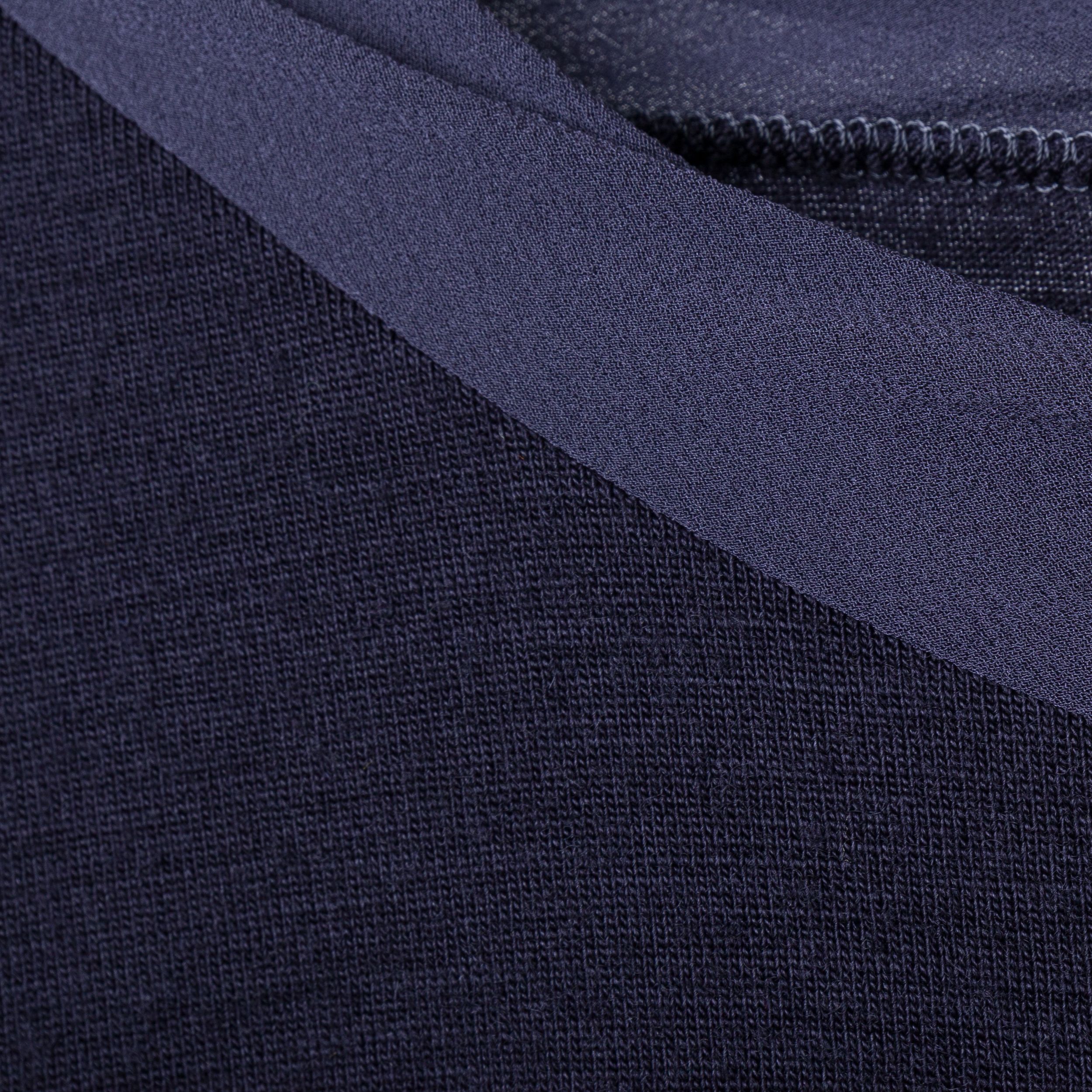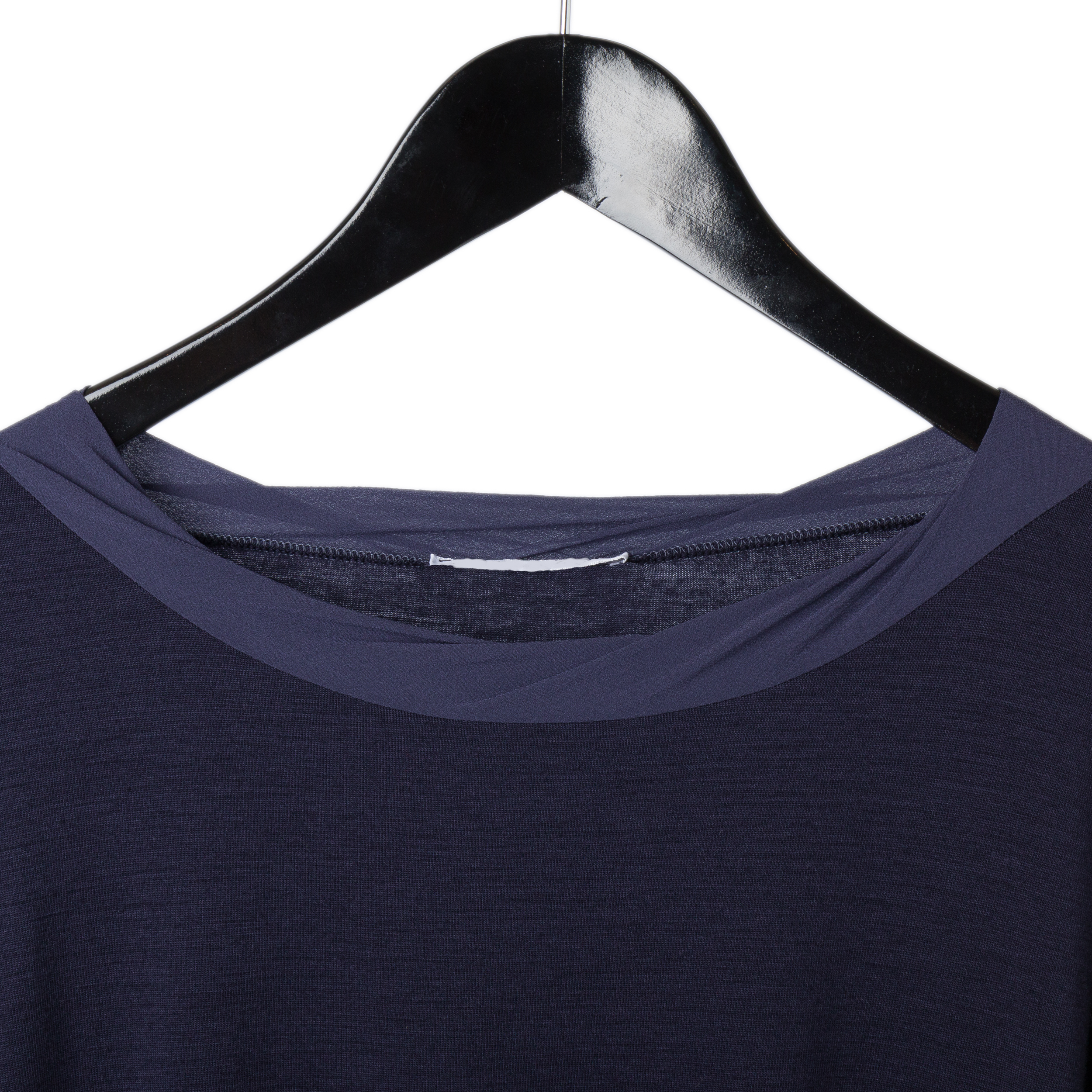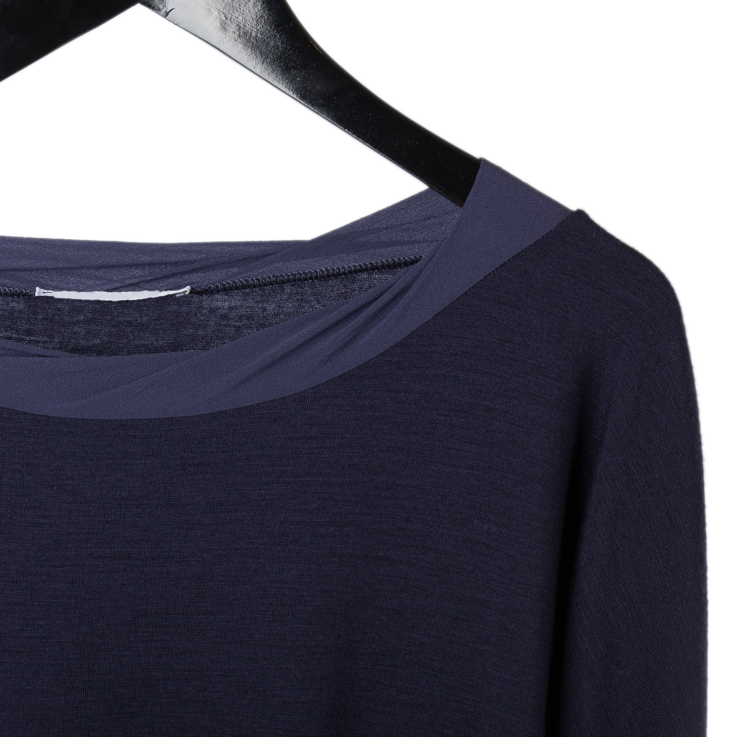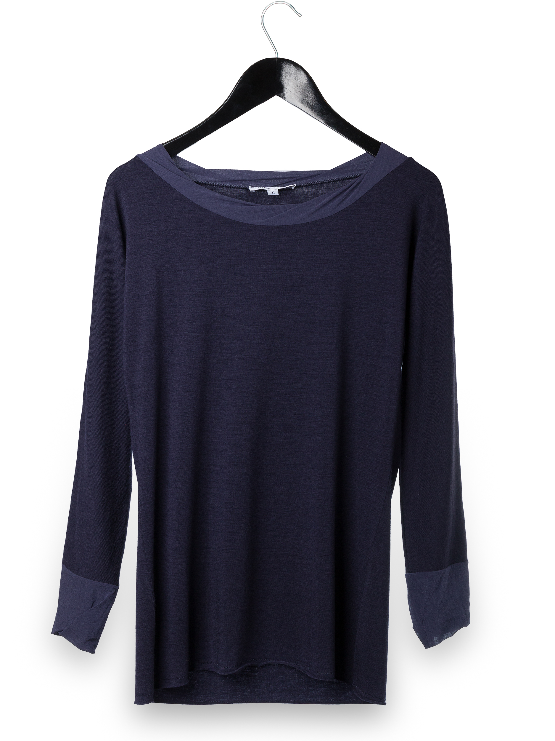 Il girocollo e i polsini sono in seta, la lavorazione del bagno di colore è la stessa, ma i tessuti differenti assorbono la tintura in modo diverso, creando un bellissimo effetto bicromatico.